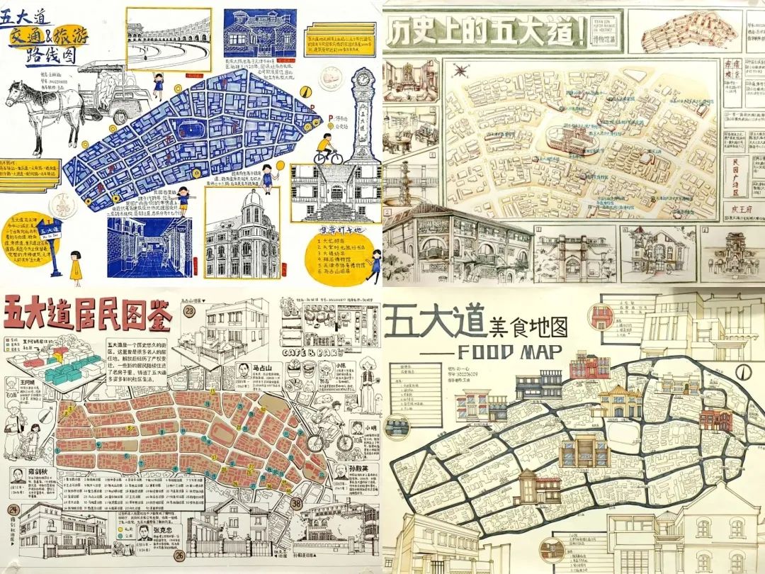 走出教室,去观察,去探索《建筑设计基础》这门课程是建筑学院大一学生的必修课,“城市观察与认知”是这门课的一个经典题目。本年度选择五大道地块,要求学生绘制游览地图,同时也要传递出场景信息,以此来体现出同学们观察城市、理解城市的视角,帮助学生们建构在城市、街区、街道等宏观尺度下认知和分析的能力。