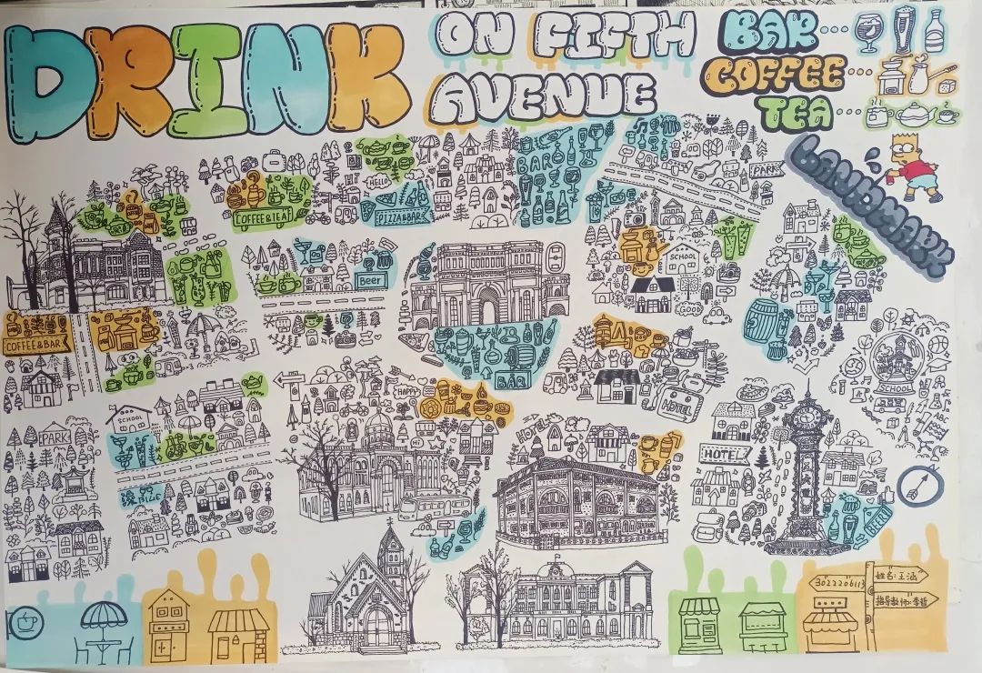 作者:王涵作品介绍:我的作品灵感来源于涂鸦艺术家,通过紧凑的画面和纷繁的卡通形象来展现我对五大道的理解。我的主题是五大道的饮品,有酒、咖啡和茶,因此色调也就对应选择了蓝色、橙色和绿色。在主要的地标性建筑之外加上这些可爱的卡通形象,能够让整幅画面显得更加活泼。