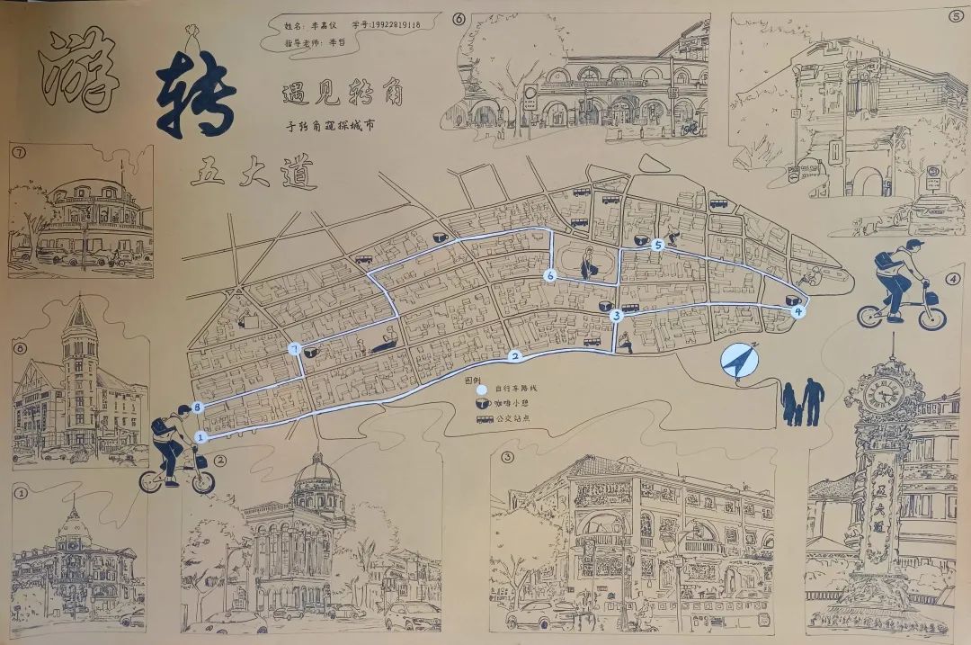 作者:李嘉仪作品介绍:我的主题是“转角”。其既能表现出一个建筑的立体感,让建筑的美得到充分的展现,并且每时每刻都有无数的故事,情感在转角发生,让游客得以窥探城市。在骑行五大道的过程中,我为很多的转角而停留,去通过观察转角来窥探天津,并由此设计出了一条转角路线。