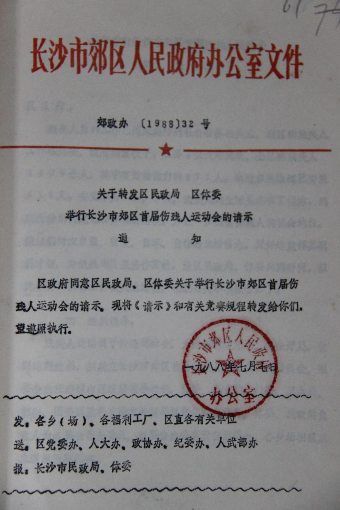 1988年7月7日,长沙市郊区颁发《关于转发区民政局 区体委举行长沙市郊区首届伤残人运动会的请示通知》。1991年7月至9月,郊区第二届农民运动会举行。设田径、篮球、象棋、乒乓球、自行车负重5个项目。通过比赛,决出了40个团体名次,151个个人名次。