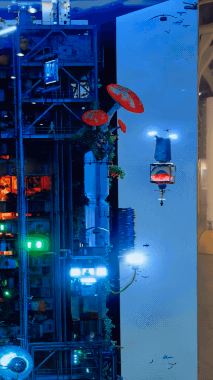 有很多细节,比如在顶层的屏幕,你可以看到一段加速播放的我制作作品的录屏。在高处,有缩小版的《人类一号》。在建筑体中间,还穿插着我的“每一天”系列。