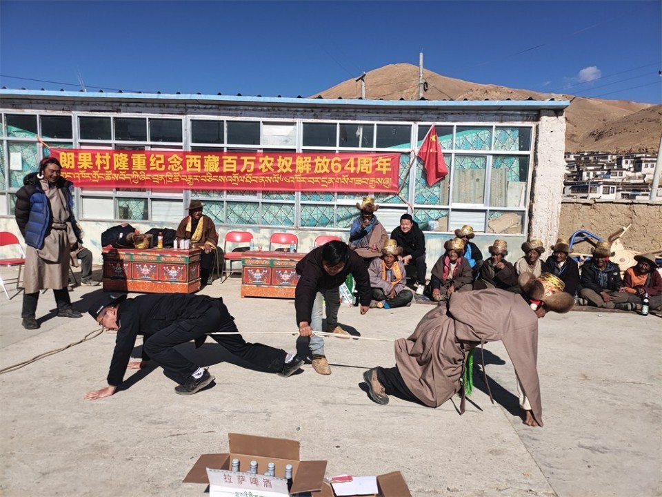3月28日,岗嘎边境派出所移民管理警察在朗果村参加“西藏百万农奴解放64周年”庆祝活动。岗嘎边境派出所供图(下同)