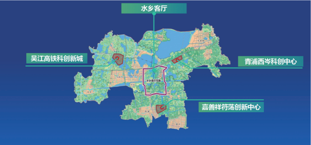 重点项目建设分为集中示范和分类示范两大类。集中示范为示范区先行启动区内重点区域建设,其中集中示范的重点区域包括“一厅三片”(图6.5)的高标准建设(图 6.6)。“一厅”指“水乡客厅”,是示范区生态绿色理念的集中实践地和功能样板区,实行跨省域统一规划,不分地区隶属,作为长三角的公共空间,项目建设由两省一市共同组建公司,采用共建共投的机制,未来也将用一套标准管理。“三片”为示范区先行启动区内的青浦西岑科创中心、吴江高铁科创新城、嘉善祥符荡创新中心片区。这些片区的项目建设围绕创新驱动为主题,如青浦西岑科创中心重点推进华为研发中心建设,吴江高铁科创新城重点加快苏州南站高铁枢纽建设,嘉善祥符荡创新中心重点聚焦创智水乡建设,建设形成集高等院所、人工智能、文旅文创为一体的特色创新中心。