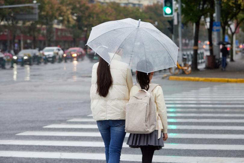 小家伙秒懂地接过雨伞,随之帮妈妈撑起了一片天。