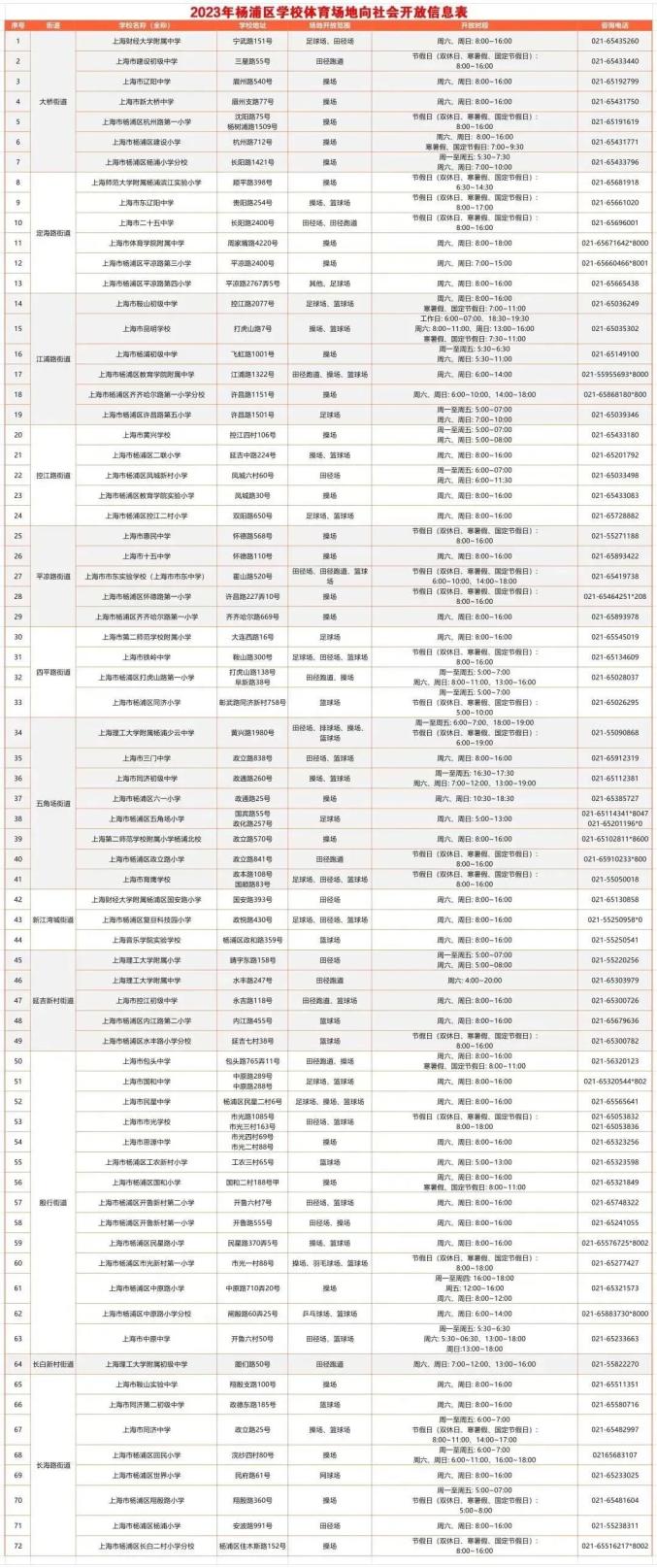 杨浦区内具备开放条件的72所学校,于3月31日起恢复学校体育场地向社会开放。学校周边社区居民、本校学生可按照要求扫脸或凭证件进入开放场地健身,未成年人进入场地活动时需由监护人陪同。(点击下图可看杨浦区学校体育场地详细安排)