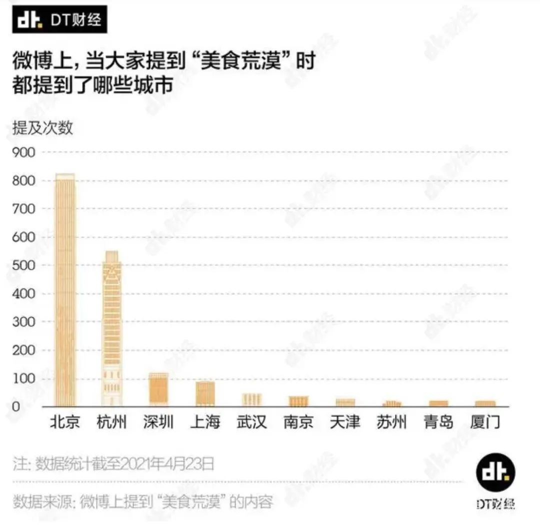 据2021年DT财经对于“美食荒漠”调查显示,杭州仅次于北京,成为被提及第二多的城市。