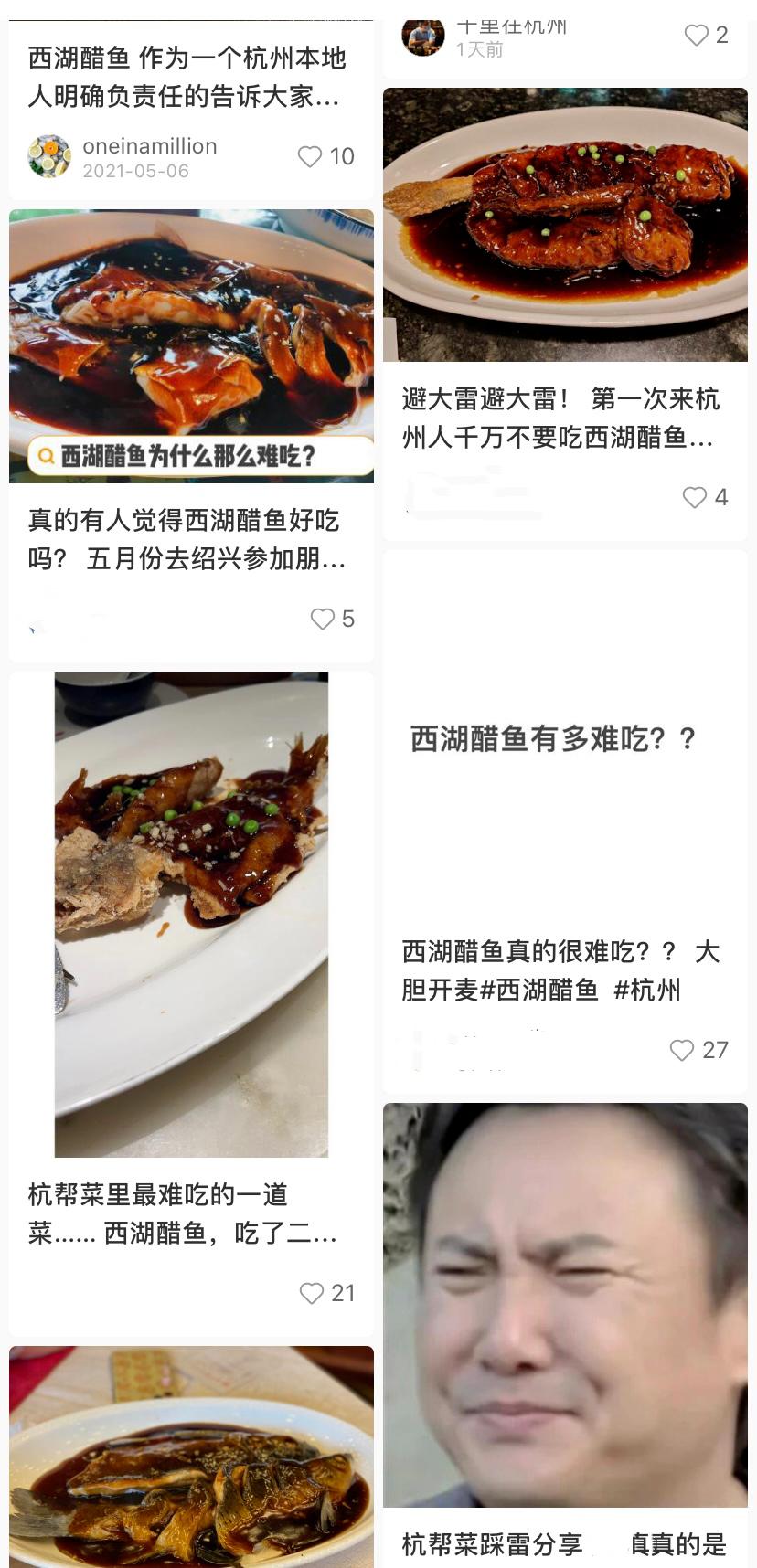 △网友们对西湖醋鱼的吐槽 图源:网络截图通过翻看大量评论,时代周报记者发现,杭州被叫做“美食荒漠”的主要原因是人们对杭帮菜接受无能。