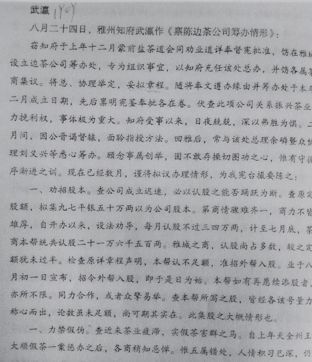 1910年四月初四,四川总督王人文片:“查川省设立边茶公司,檄委雅州知府为筹办处总办。先后集得股本银五十万两,业径前督臣趂巽奏报在案。兹据署劝业道周善培详称,川省风气未开,商民素乏智识,公司之设,事属创举。群情观望,劝募艰难,屡经挫折,几至中隳。而卒于年余立内集得巨股,组成公司,向非该知府武瀛苦心劝导。擘画有为,不能收此宏效。”可见当时创办茶业公司之艰难,正因如此,按农工商部《奖励公司章程》:“护理四川总督王人文奏请于武瀛原衔上加二品衔。”(见《政治官报》宣统三年闰六月初二日《农工商部奏议覆川督雅州守武瀛劝办公司请奖折》)。
