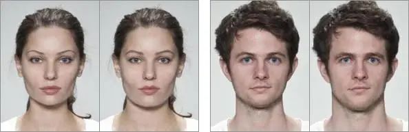 目前,研究者通常是沿着中垂线将面孔切成两半,再用其中一半做镜像以得到对称脸。用这种方法能得到“左-左”和“右-右”两张对称脸,但无论是哪一张,大脑对它们的“打分”都要比原始脸高。比如在前述罗兹教授的实验中,她还以日本脸为原型制作了对称脸,结果对称脸的得分平均要高0.2分。