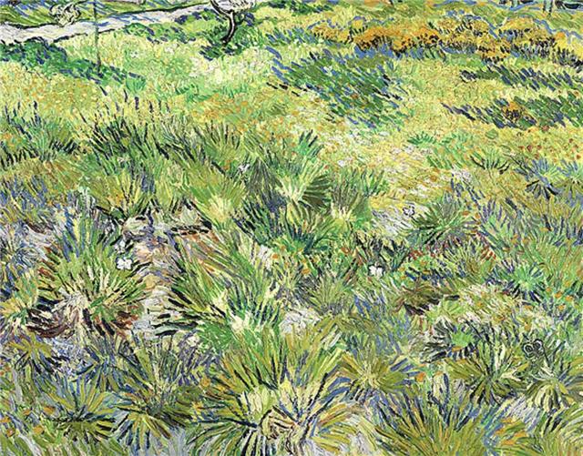 梵高,《长草地与蝴蝶》,1890年从1889年5月至1890年5月,梵高因病住入法国南部圣雷米附近的一家精神病院,院方允许他在医院的一些特定场所作画,其中就有一片被梵高称为“废弃花园”的地方。他形容那里“草长得又高又乱,夹杂着各种杂草”。在院期间,梵高创作了诸多素描和油画作,都描绘了这一小片人迹罕至的花园。