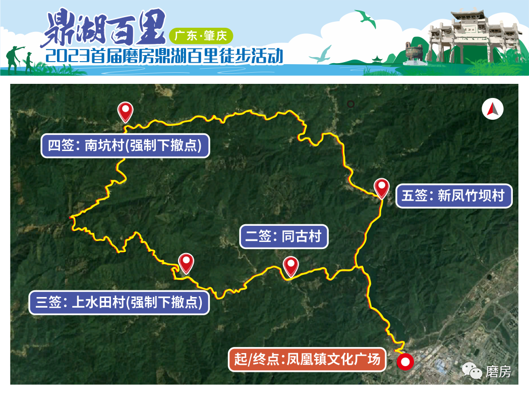 凤凰镇文化广场(起点:0KM)—新凤村—九龙湖风景区—同古村(二签:7.3KM)—藏龙沟路口—佛坳村—大龙村路口—上水田村(三签:12.1KM)—小龙北岭严洞林场上水田村官田村路口—小龙北岭严洞林场—南坑村(四签:26.2KM)—王龙坑村路口—太平田村路口—田心村—大应村路口—高坑村路口—高鹤村—双坑村路口—白石坑村—鹅公斗村—大朱石村路口—罗坳村—新凤竹坝村(五签:39.1KM)—九龙湖风景区—凤凰镇文化广场(终点:46.1KM)