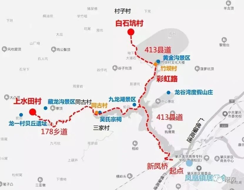 其中途径新凤村、同古村、竹坝村、白石坑村、上水田村、九龙湖、藏龙沟、黄金沟等自然风景区,有着得天独厚的生态环境和浓郁的客家风情。