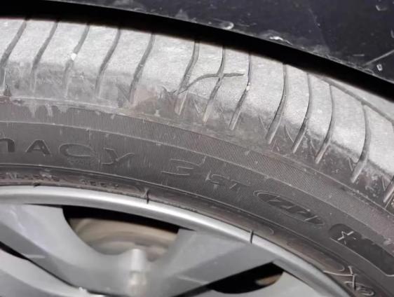 胎面老化开裂、胎面、轮毂周围都出现密密麻麻的裂痕,说明老化已经非常严重。