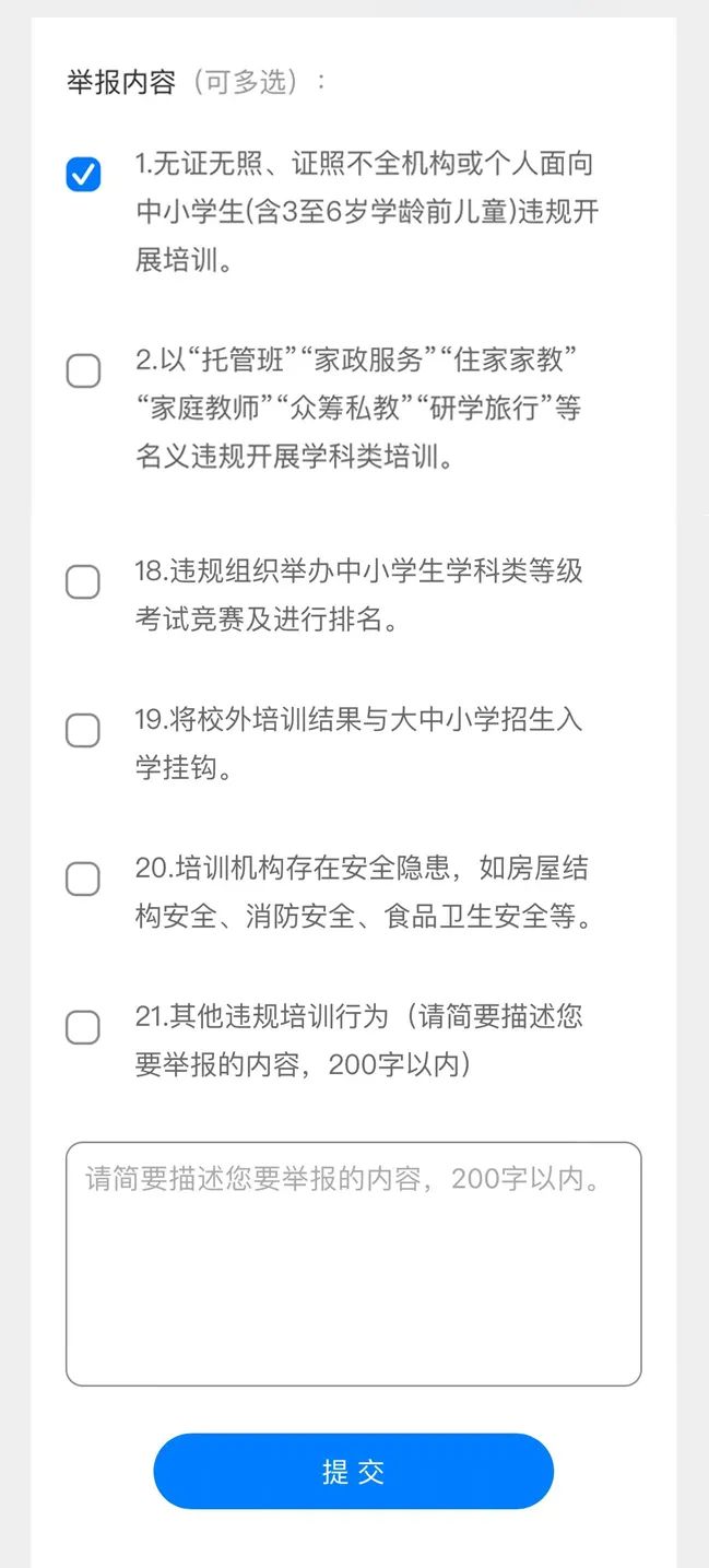 举报内容包含20项常见的违规培训行为,您可以选择相应的举报内容,如无符合您所看到违规培训行为,可以选择最后一项即其他违规的培训行为,并可以在下方填写您想举报的内容。点击【提交】即可成功举报。