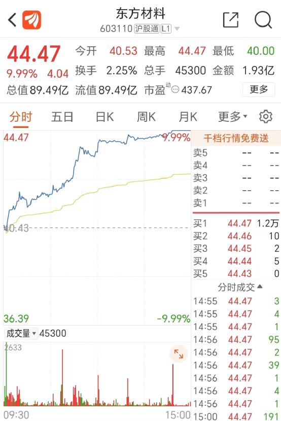 4月7日,东方材料股价以涨停报收;2019年以来,东方材料股价最大涨幅达649%。