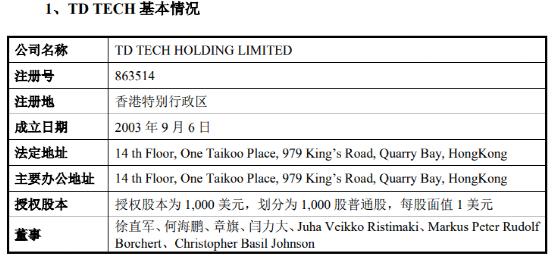 据公告披露信息,TD TECH 公司注册于香港,诺基亚和华为分别持有51%、49%股权,其董事中的徐直军、何海鹏、章旗、闫力大,均为华为高管,其中,徐直军是华为副董事长、轮值董事长。
