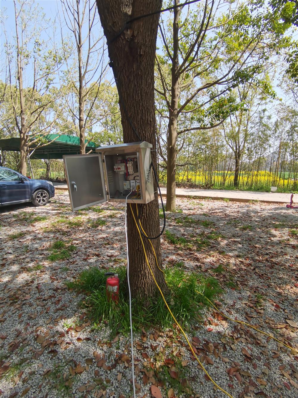 粗壮的黑色电缆线从树木枝丫中穿过,接入树根部铁皮电箱里的插座,供露营者用拖线板接出使用。