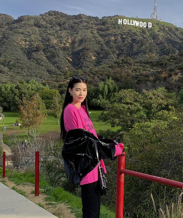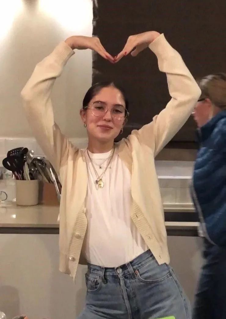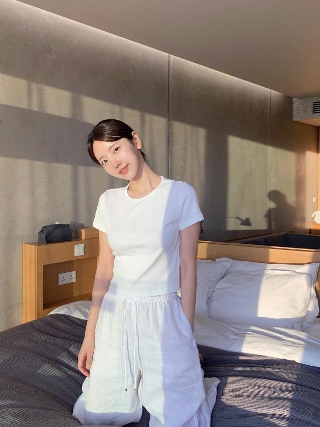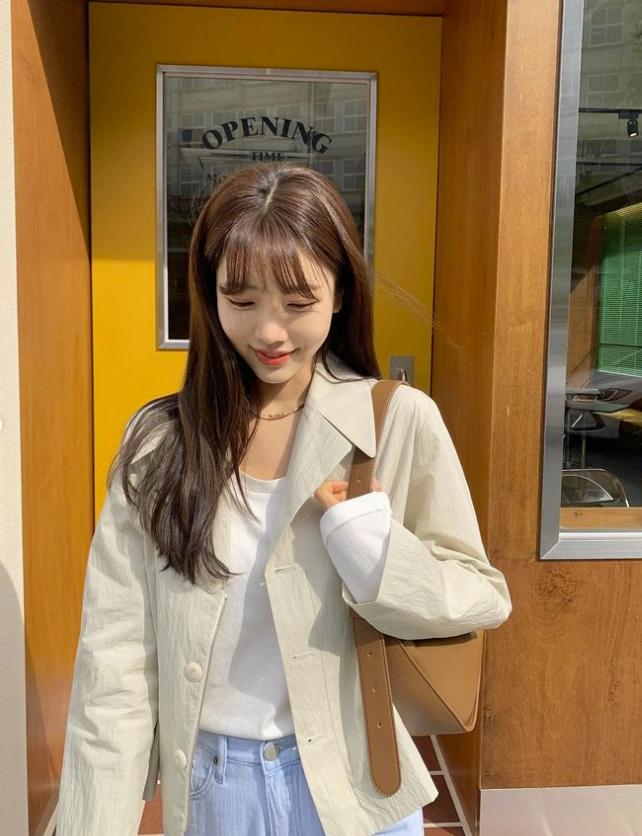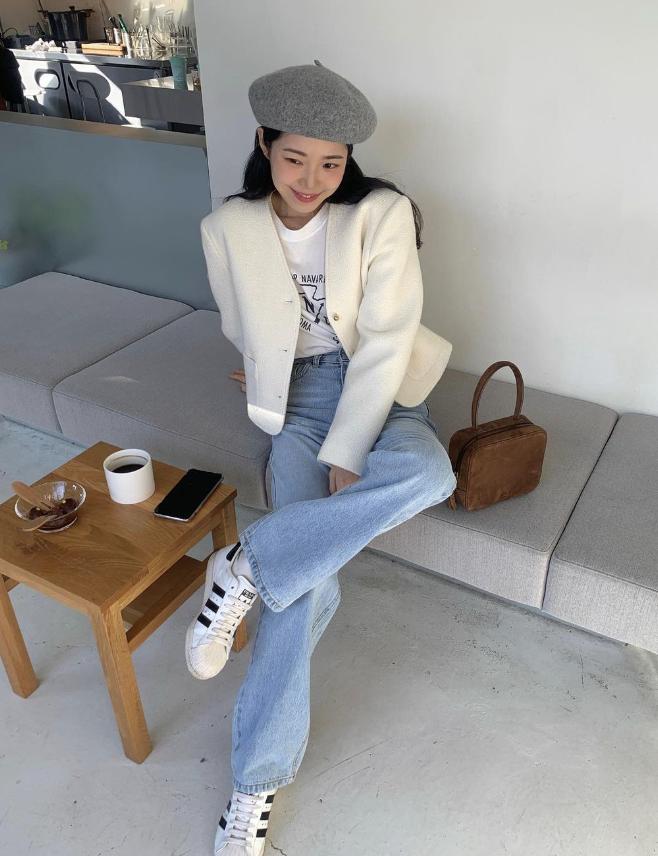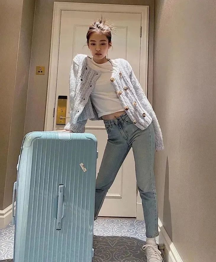 jennie用短款T恤搭配紧身牛仔裤,浅蓝色的针织外套跟白T颜色清新靓丽。