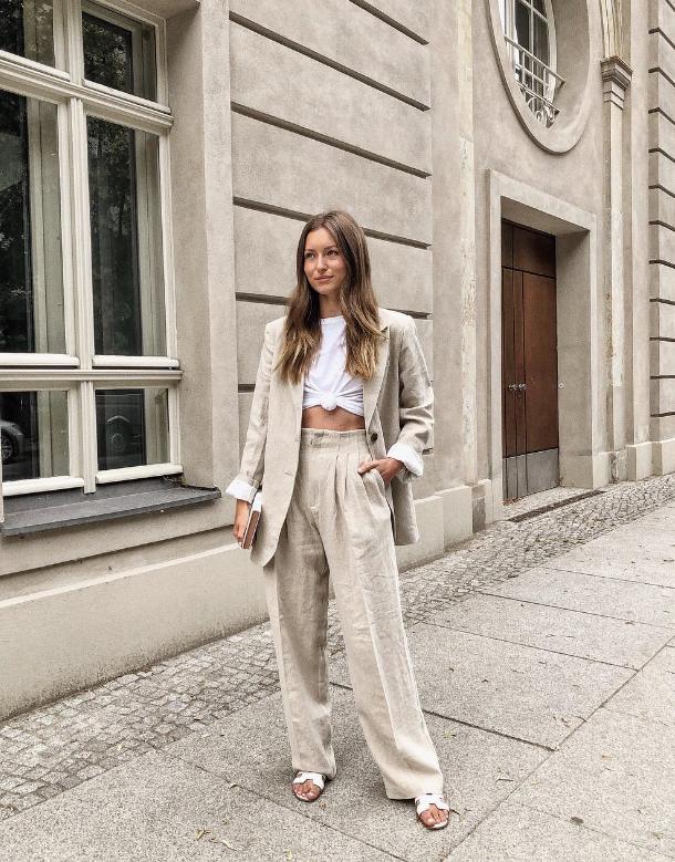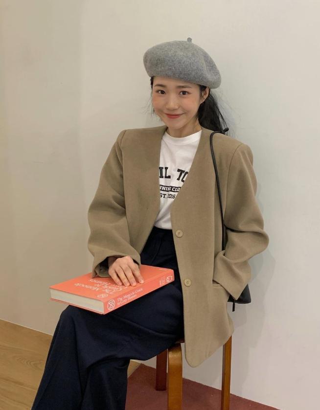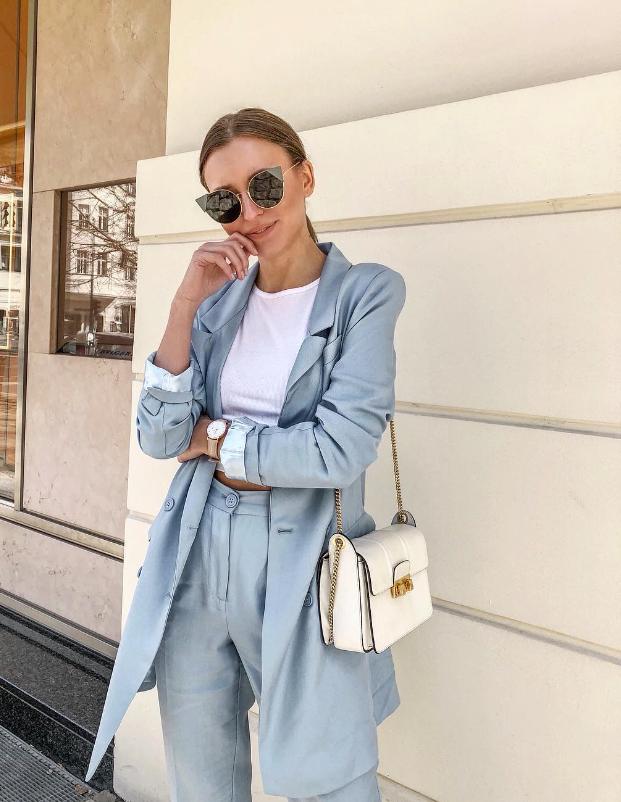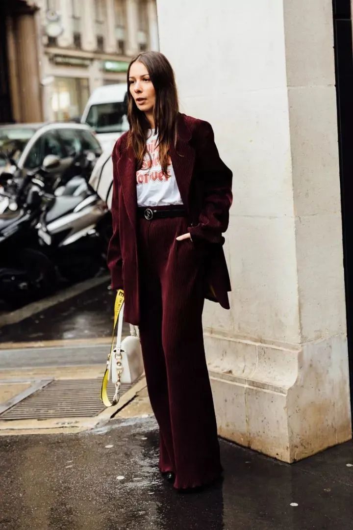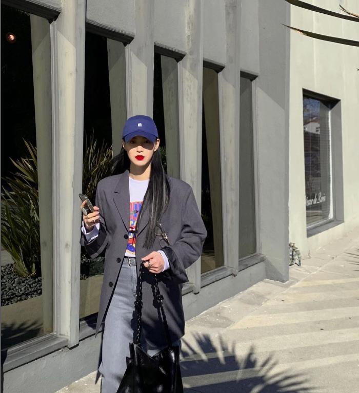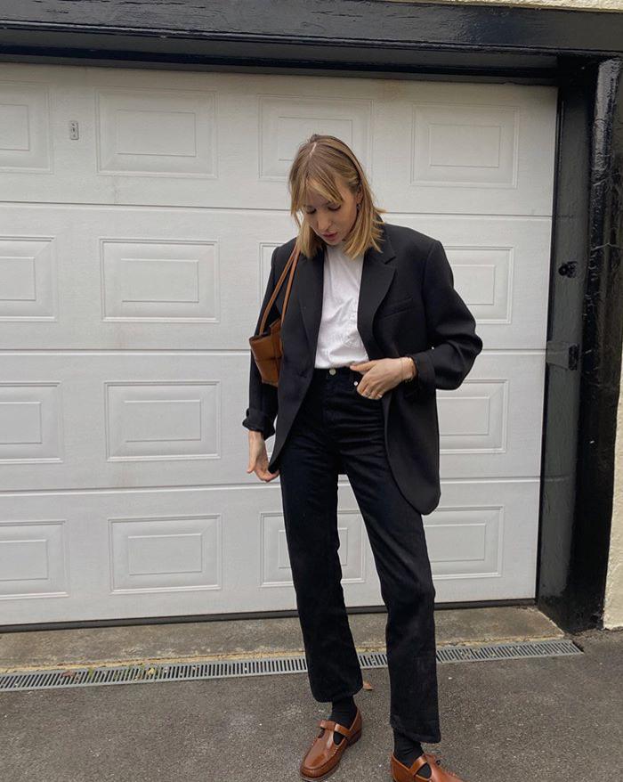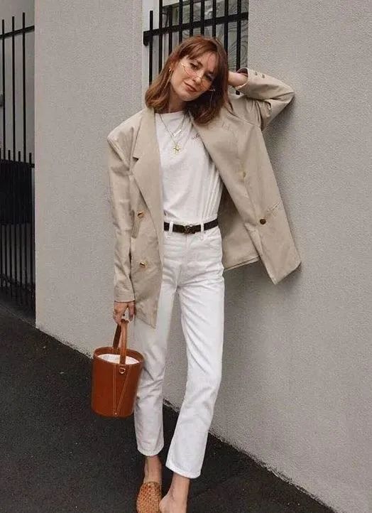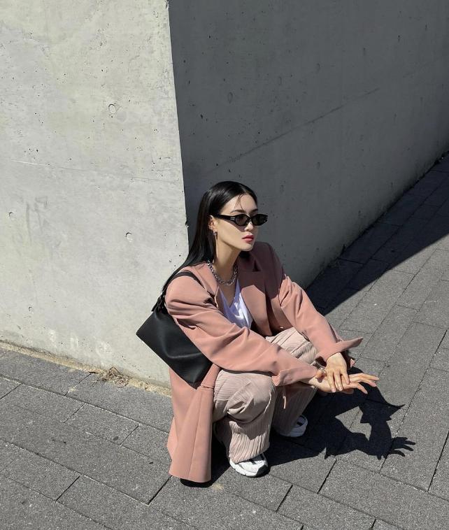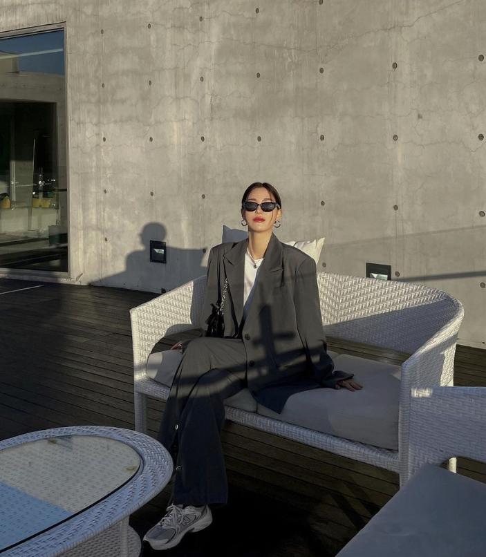 廓形西装+T恤的穿搭特别要注意配饰的搭配,不然就会显得很空很干。