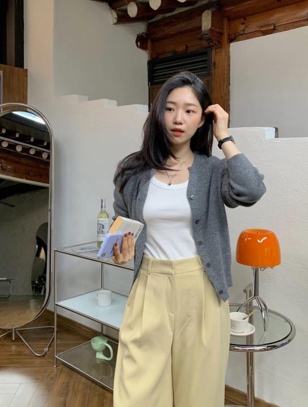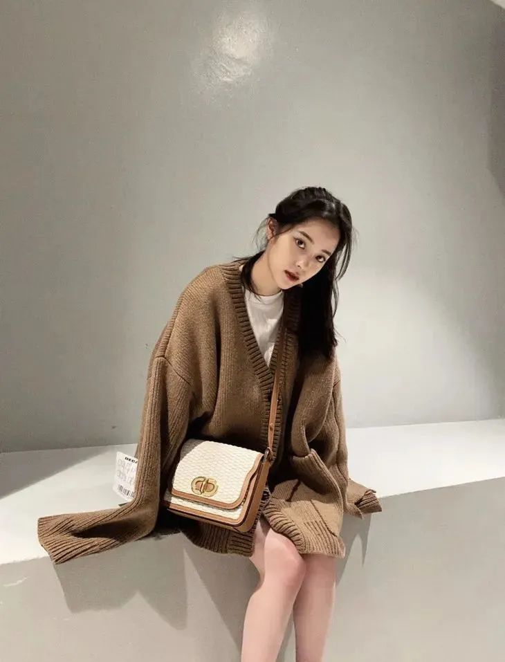 厚重的针织开衫内搭T恤,一薄一厚的搭配体现松弛感的穿搭,不是那种随随便便的日常家居服,而是整体给人舒服放松的感觉。