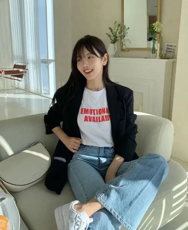 印花T恤+西装+牛仔裤,即使是黑色小西装,也被活泼元气的氛围感染到,多了几分减龄效果。
