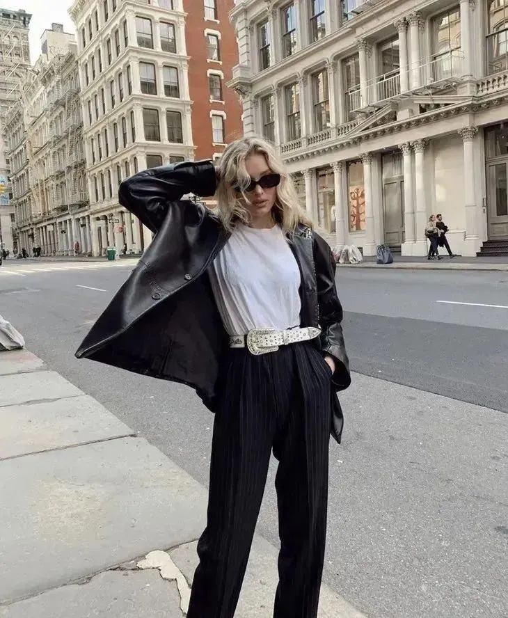 皮衣+白T,更是将中性和痞气结合相得益彰,恰到好处!