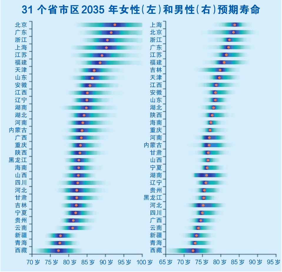 广东女性、西藏男性预期寿命增幅最大。研究预测,所有省份预期寿命均将大概率持续增长,女性增幅最大的是广东省、北京市、浙江省和福建省,分别增长6.3、5.7、5.5和5.1岁;西藏自治区、福建省、广东省和吉林省的男性预期寿命增长幅度最大,分别增长4.9、4.4、4.3和4.1岁。