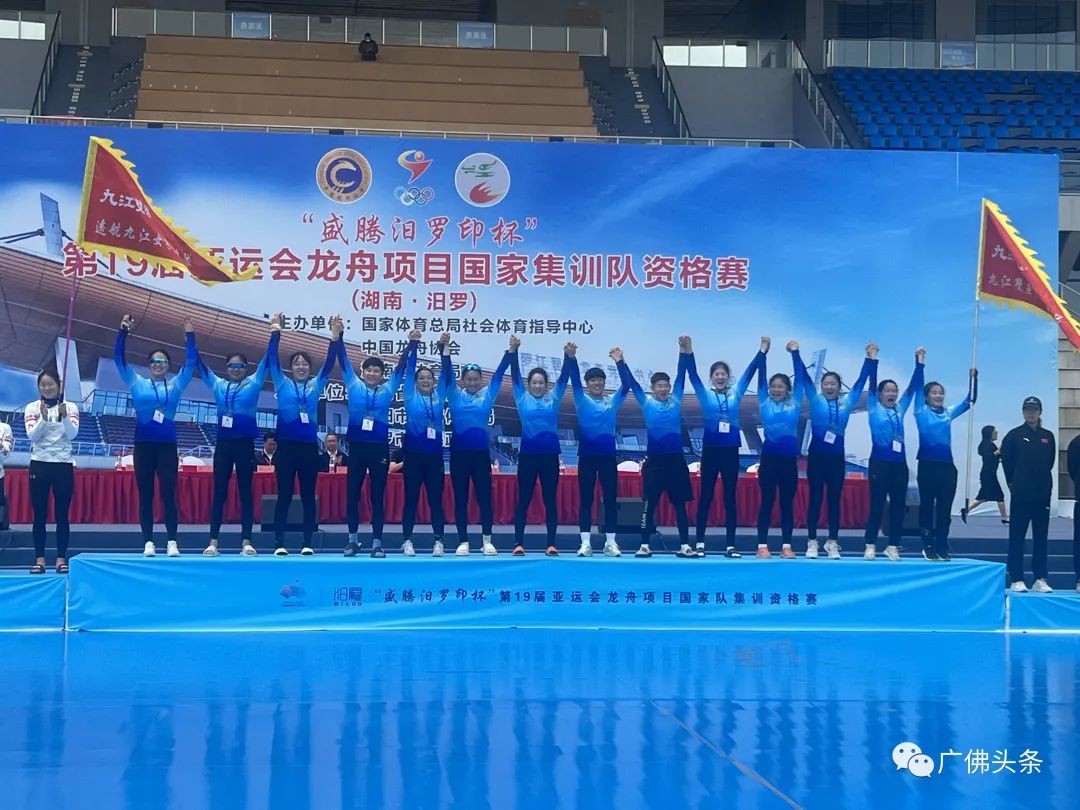 九江双蒸女子龙舟队站上冠军领奖台。第19届亚运会龙舟项目国家集训队资格赛,依次进行男、女子12人龙舟200米、500米、1000米的直道赛,每一项目比赛均分为三轮展开角逐。顺德乐从罗浮宫龙舟队领队劳剑辉告诉记者,亚运会资格赛“12选6”,晋级的队伍还将参加亚运龙舟选拔赛和积分赛,最终选拔出优秀队伍代表国家参加亚运会,整个过程“优中选优”。