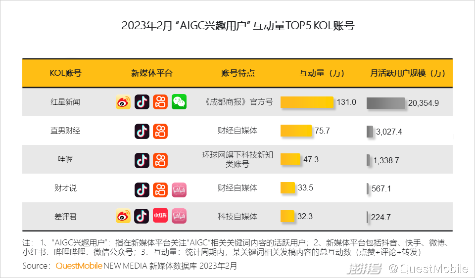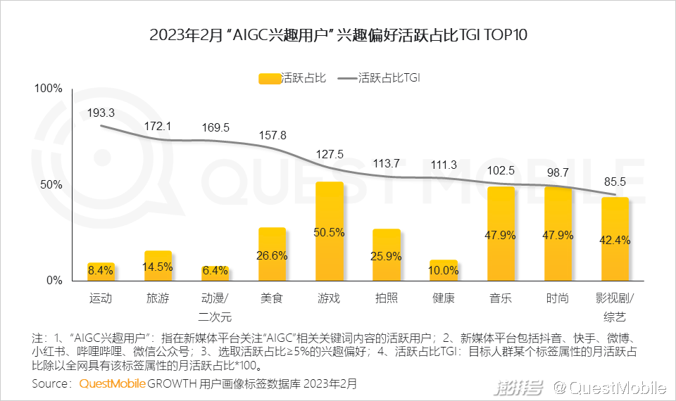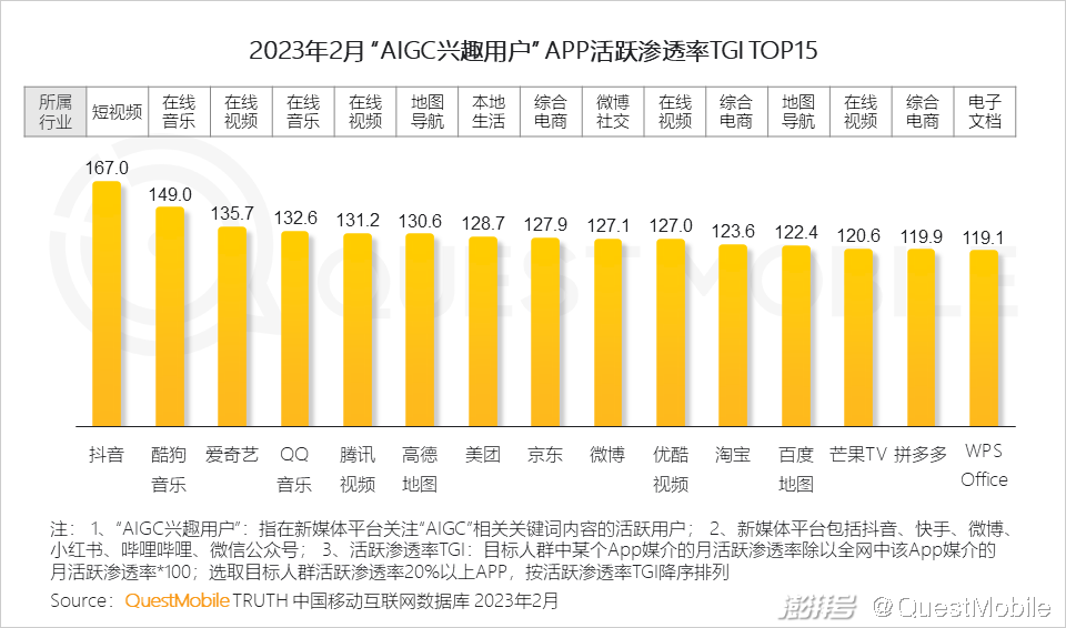 QuestMobile数据显示,随着算力、算法、数据三大底层能力的逐步成熟,生成式AI进入加速成长期,AIGC应用体验得到大幅提升,大厂和创业公司争相布局,国家政策持续引导,AIGC已然成了PGC、UGC之后新的风口,在2月份,国内用户对AIGC领域的关注度提升了数百倍。