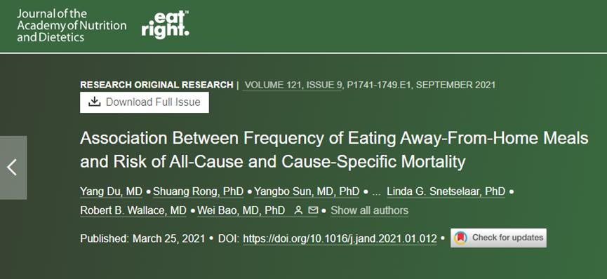 这篇论文于2021年发表在Journal of the Academy of Nutrition and Dietetics上,文章名为“Association Between Frequency of Eating Away-From-Home Meals and Risk of All-Cause and Cause-Specific Mortality”,中文译作“外出就餐频率与全因和因死亡率风险之间的关系”。