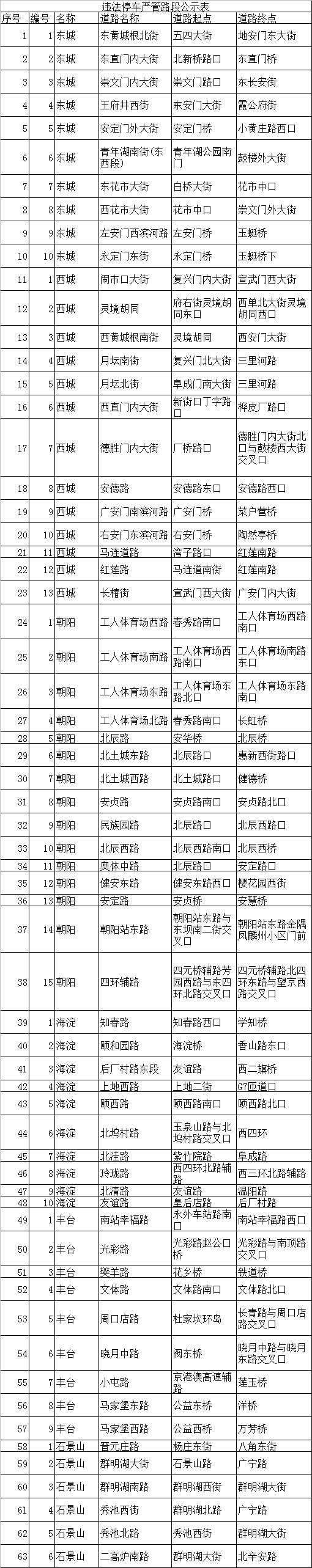 北京市交管局发布公告,为进一步加强道路交通安全管理工作,维护道路交通秩序,提升道路通行效率,决定对部分区域63条路段突出机动车违法停车严格管理。具体路段名单如下: