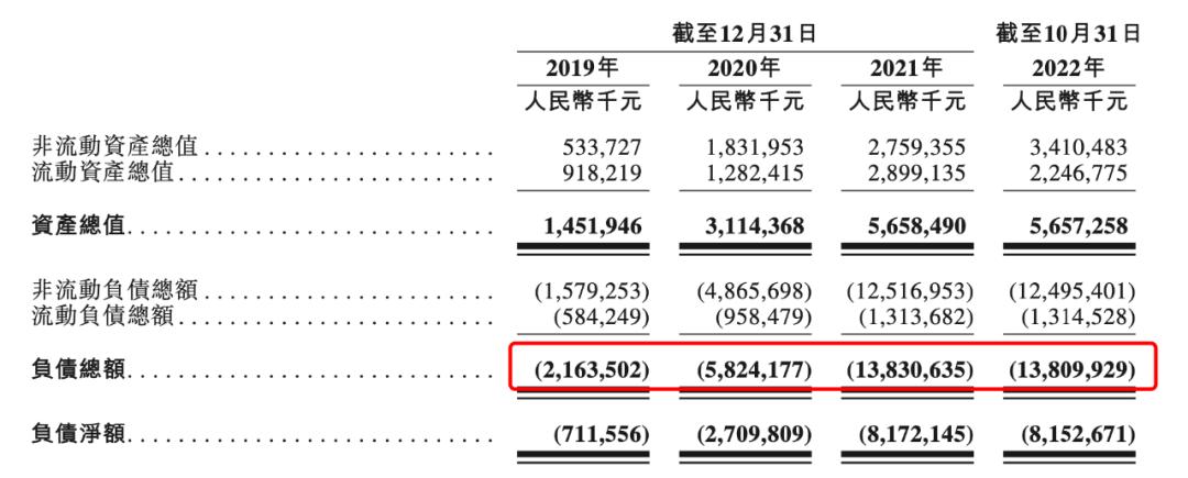 此举背后,或因KK集团巨额债务压顶。招股书显示,从2019年至2022年10月31日,KK集团的负债总额由21.64亿元狂飙至138.1亿元,不到三年间暴涨6.38倍。