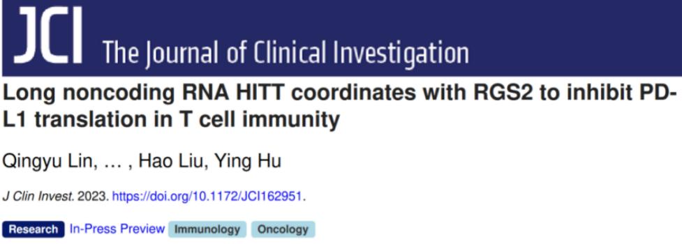 2023年4月4日,哈尔滨工业大学生命科学与技术学院胡颖(中国细胞生物学学会肿瘤细胞生物学分会委员)中国细胞生物学学会肿瘤细胞生物学分会委员教授课题组在The Journal of Clinical Investigation杂志发表了题为Long noncoding RNA HITT coordinates with RGS2 to inhibit PD-L1 translation in T cell immunity的研究论文。该研究深入解析了肿瘤细胞自身表达的lncRNA分子参与调控PD-L1蛋白翻译的新机制,并发现了该机制在调控T细胞抗肿瘤免疫中的重要作用。