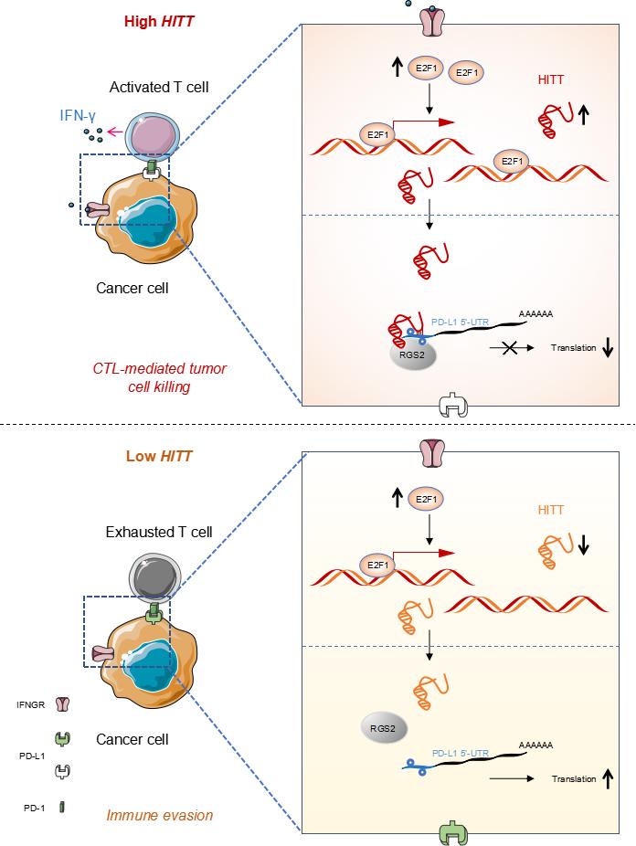 综上所述,该项研究发现了表达于肿瘤细胞,具备调控T细胞免疫能力的lncRNA基因HITT,揭示了HITT调控PD-L1蛋白翻译和表达的分子机制,明确了HITT在靶向PD-1/PD-L1信号,提高免疫检查点阻断疗效中的作用,提示HITT分子作为免疫检查点阻断因子的潜在临床应用价值。