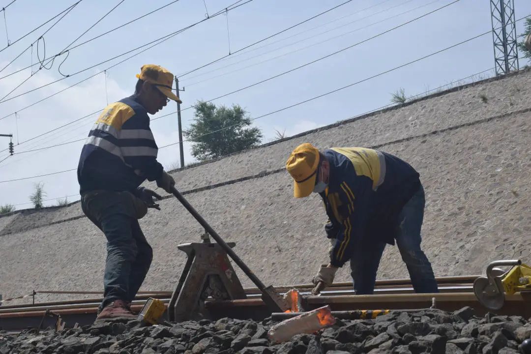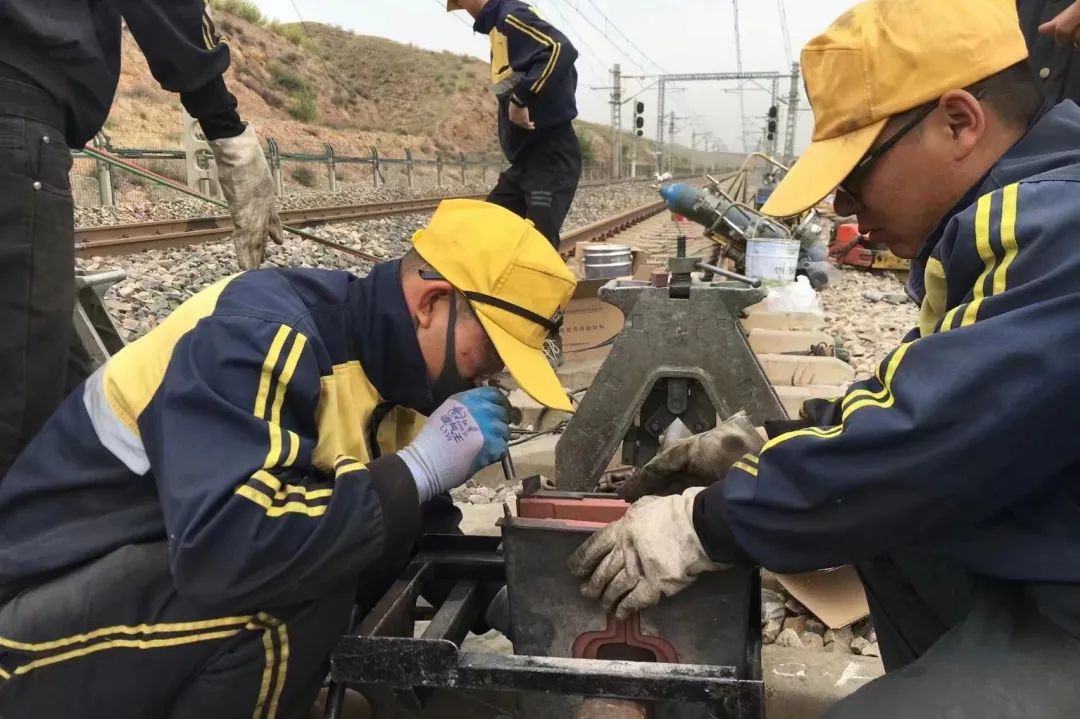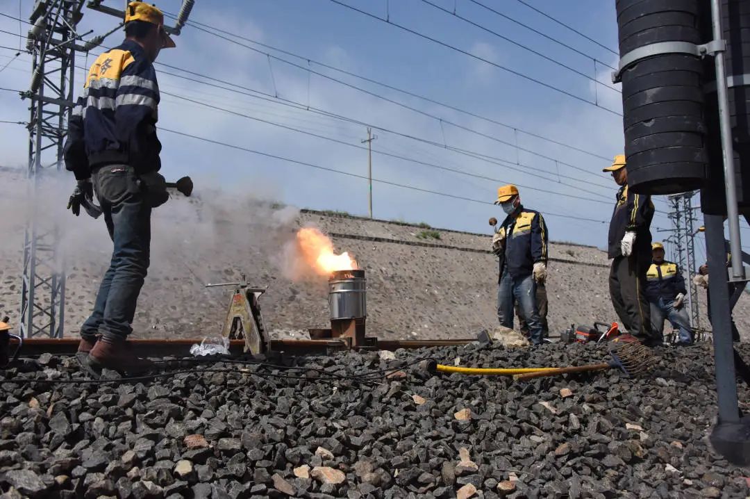 待钢水与钢轨融化为一体后焊轨作业基本完成