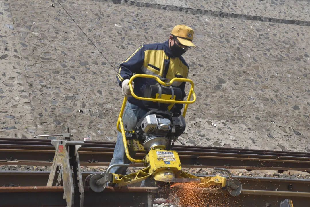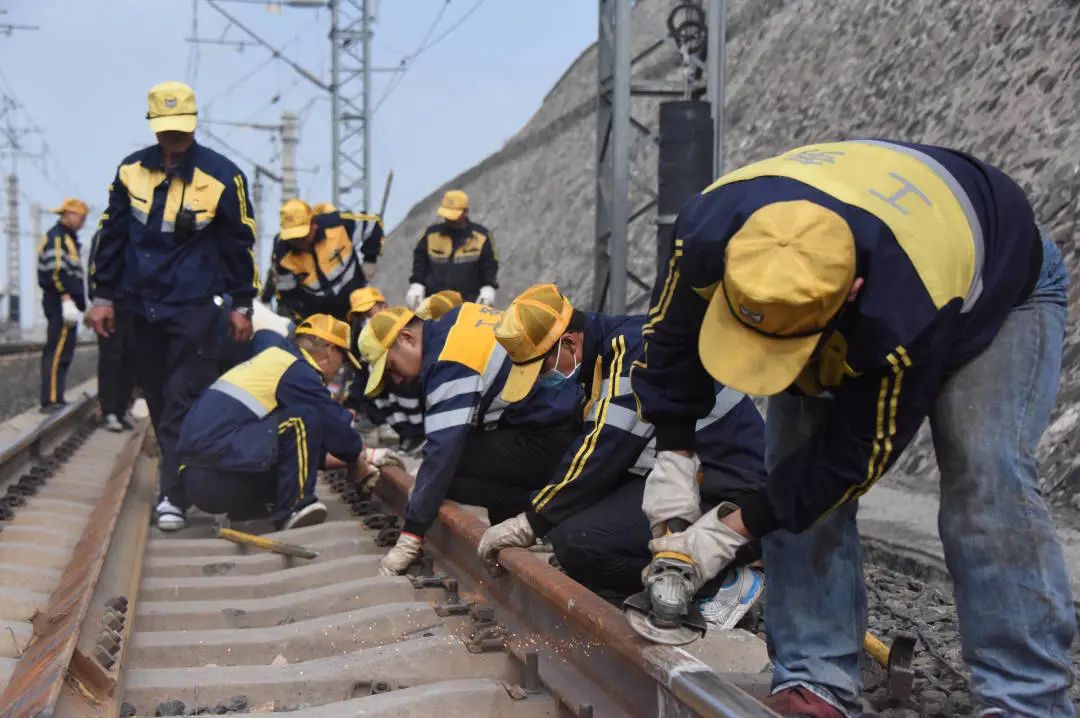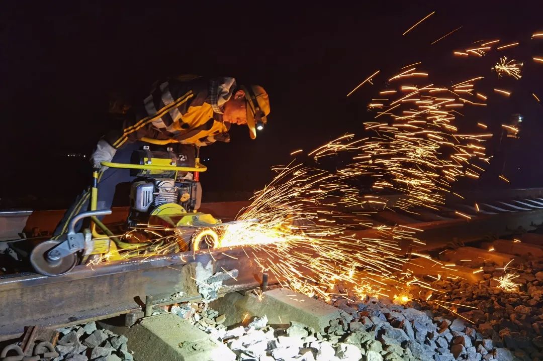 在焊轨之前焊轨师傅对焊接前的轨端进行除锈