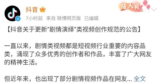 一直以来,剧情类视频都是短视频行业重要的内容品类,涌现了众多优秀的创作者和作品,丰富了广大网友的精神生活。但近年来,也出现了部分剧情视频作品在网友、媒体传播、转载过程中,因为前后语境缺失引发误解,被误以为是真实事件,给网友和创作者都造成了不良影响。此外,还有极个别创作者试图利用虚假人设、情节、场景、道具等编造不实信息,凸显对立或冲突效果,从而达到不当获取流量甚至变现的目的。