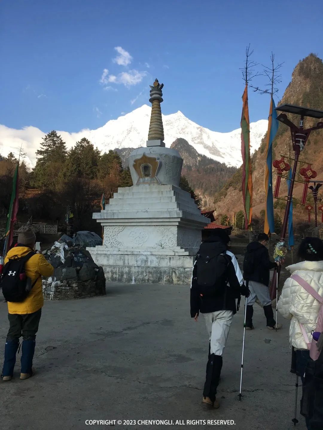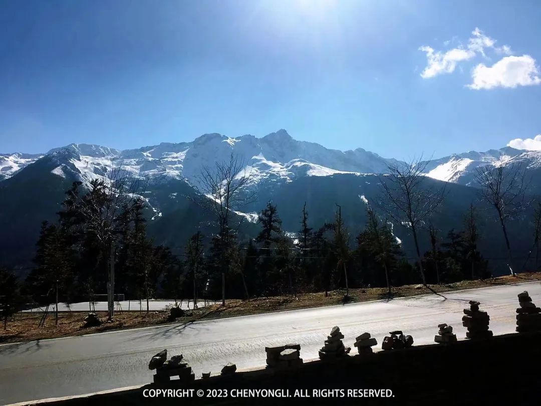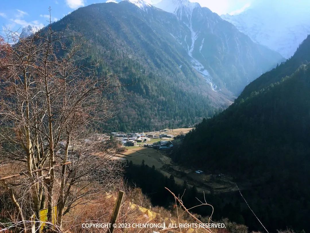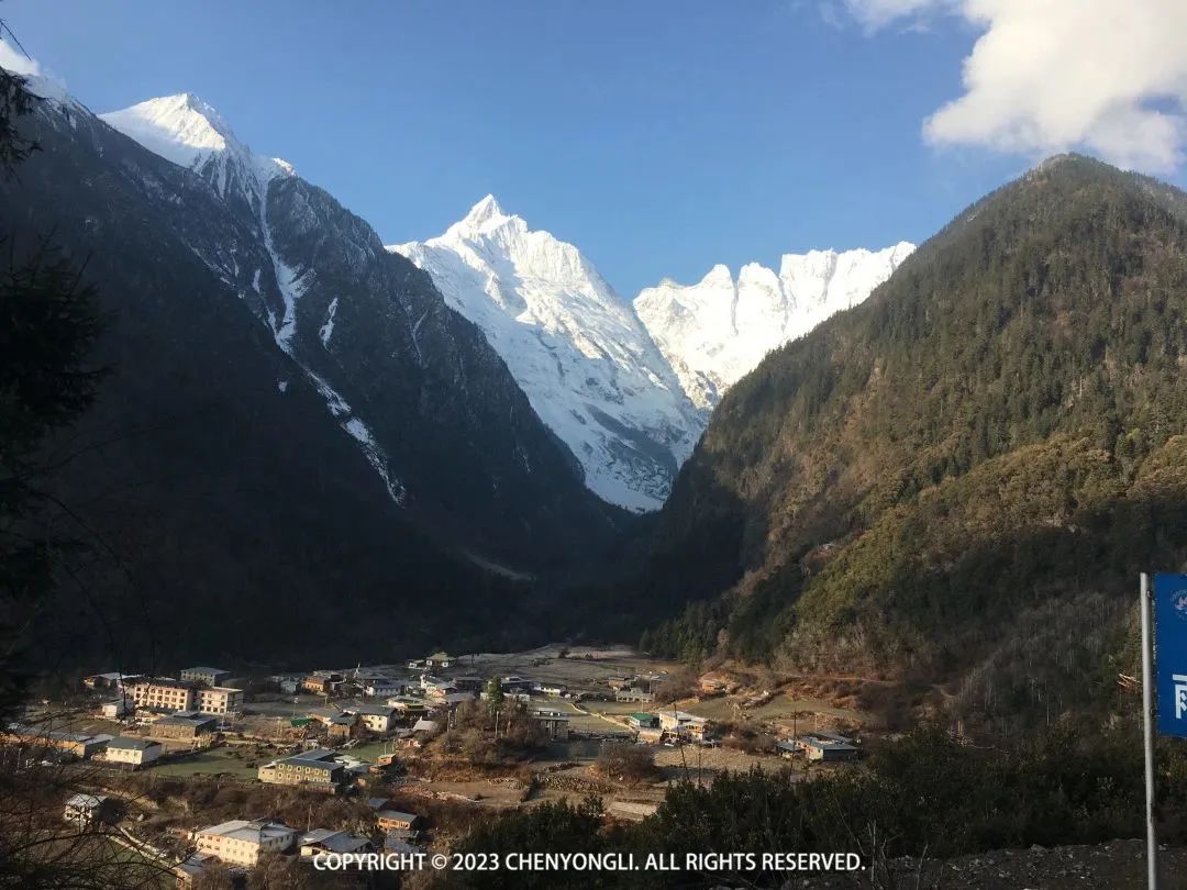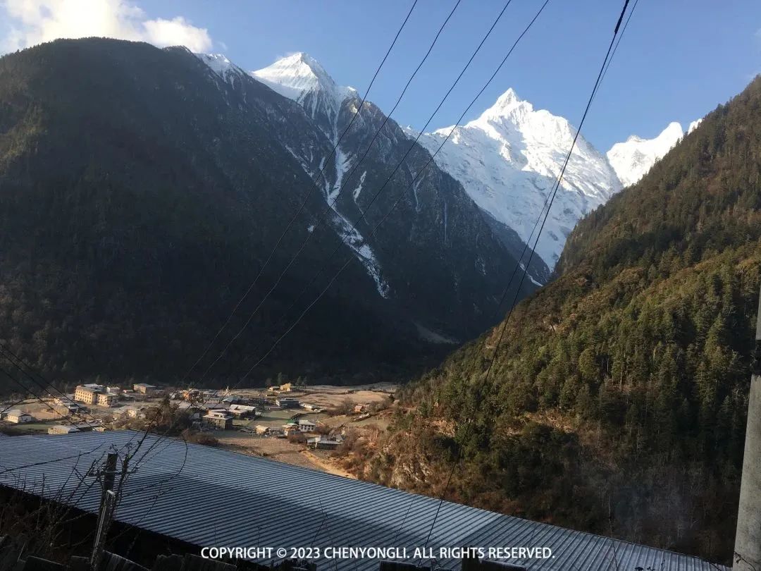 今天有16公里徒步,一半土路和一半水泥路,走过了两天,对自己的体力还算认可,于是包也自己背着走了。8:30 大家开始出发了,出村子时拍了几场雪山照片,神女峰和吴冠峰已经完全漏出来了。上下雨崩村都在一片安宁祥和中。