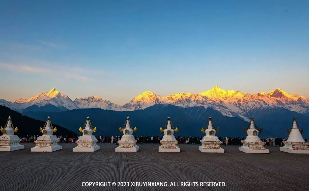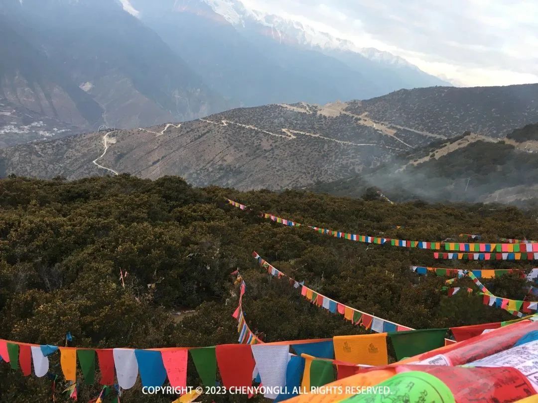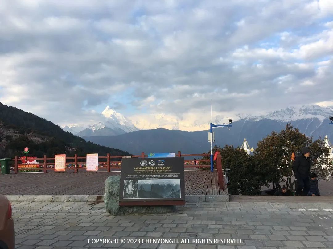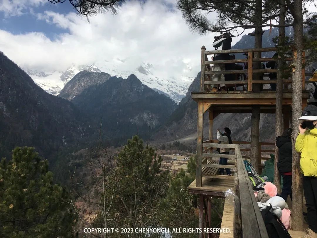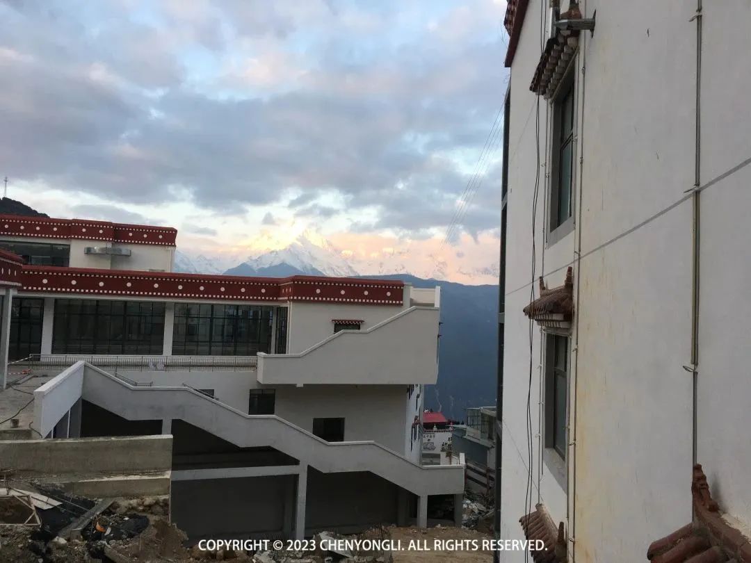 D2:飞来寺—西当—南争垭口—雨崩村早上7:40出门去看日照金山,在酒店旁边看到日出升起,能看到两座雪峰的日照金山了。本来想去楼顶上去看的,没看到楼梯在哪,又怕错过,于是快速跑步到观景台去看。可刚到观景台,就发现露出的雪峰已经被雾遮挡了。