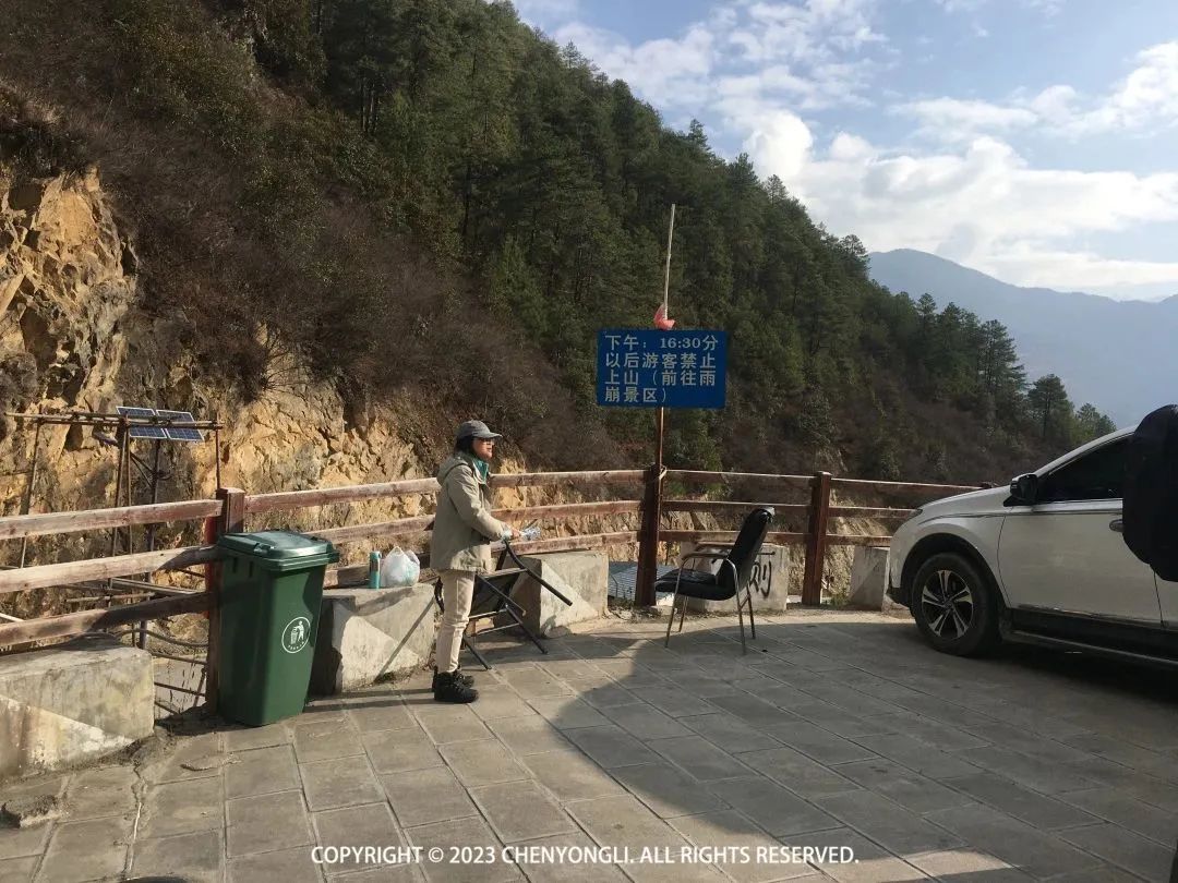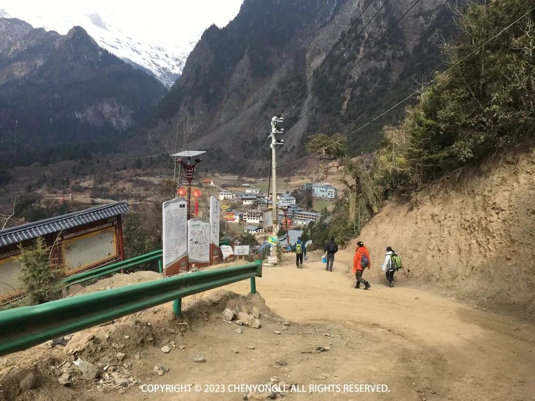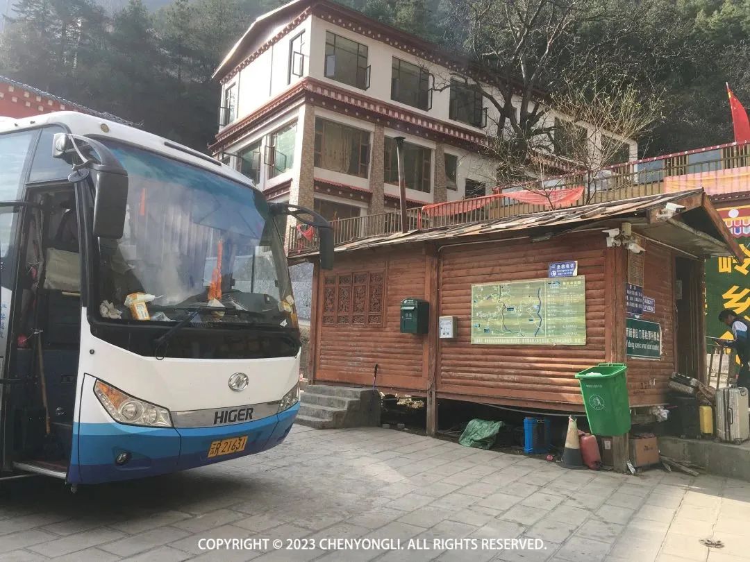 乘车进入雨崩村,一路都在爬升,都是泥土路,有点颠簸。此刻心里在想,还好没选择徒步进去,不然我把行李扔了,啥也不带都爬不上来。▼上雨崩村下车点