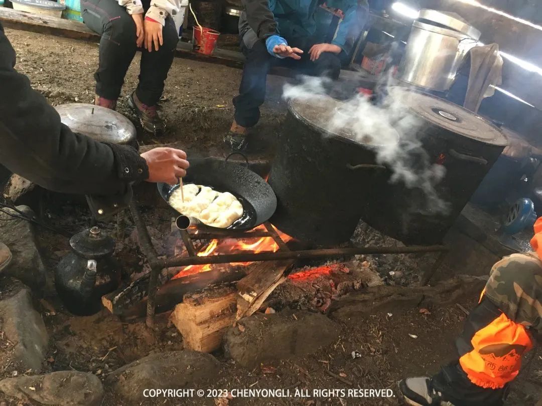 10:50 到达笑农垭口观景台。11:20 到达冰湖笑农大本营,这里可以烤火,也可以补给,有酥油茶、泡面、烤肠和饼。就老伯一个人常年生活在这里,感觉还是好孤独,有游客来还可以给大家说说话,做点吃的打发时间。