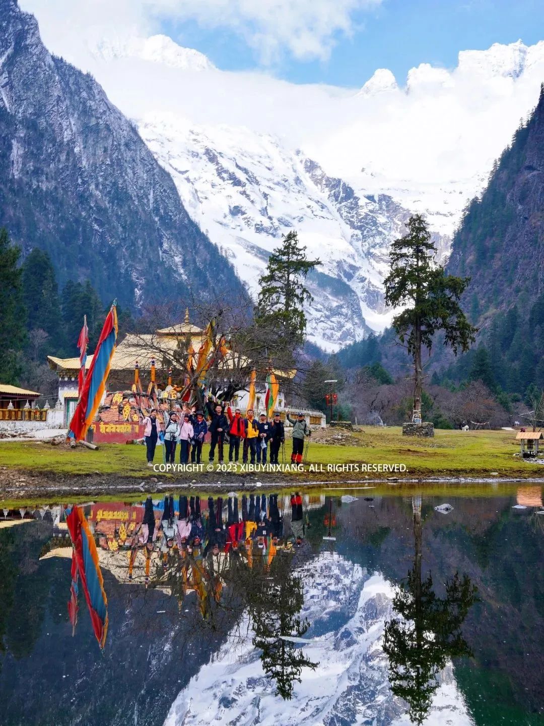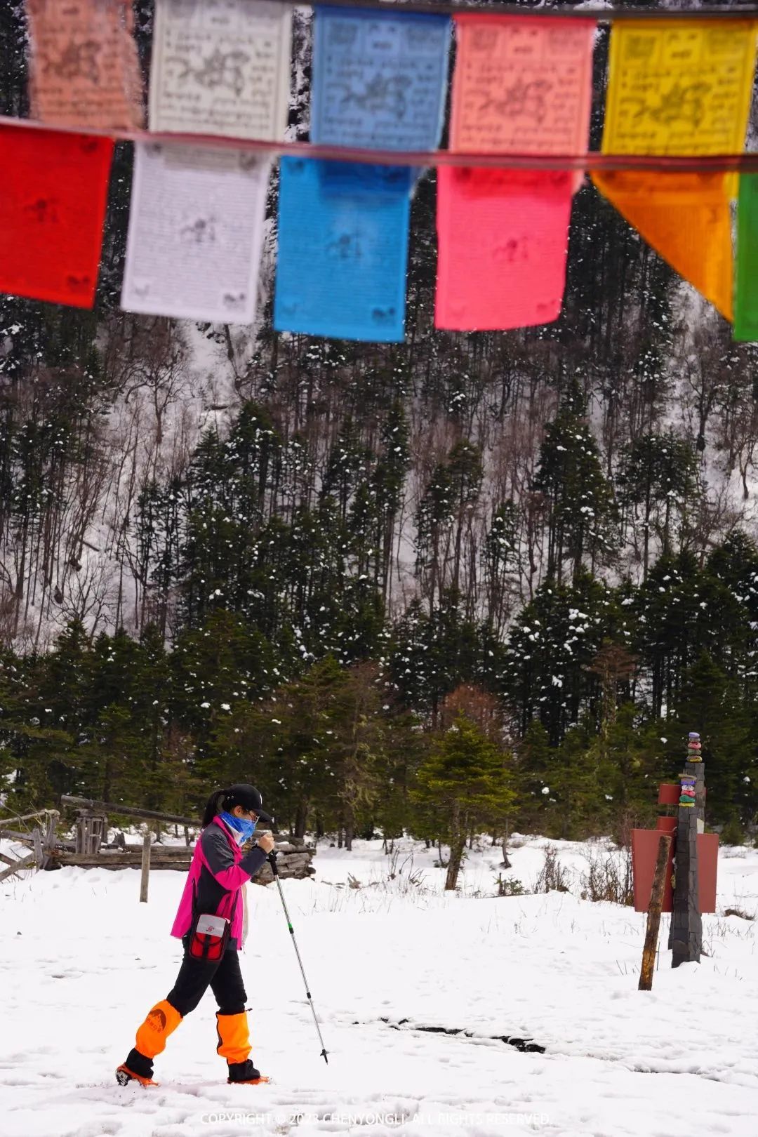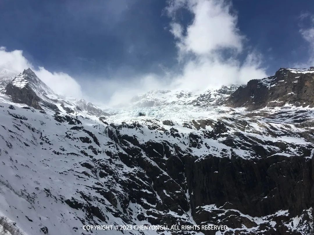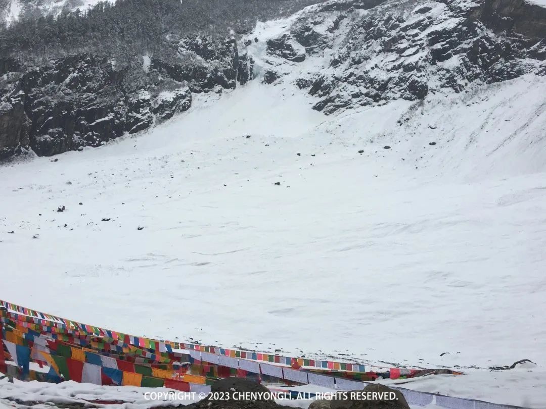 14:00 再次回到大本营,让摄影师拍了几张好看的照片。然后一路回撤,下山途中,天空中开始下起雪花,而此时雨崩村大太阳,正如领队所说,我们此行会经历春季、夏季和冬季,就是这是属于雨崩的魅力。