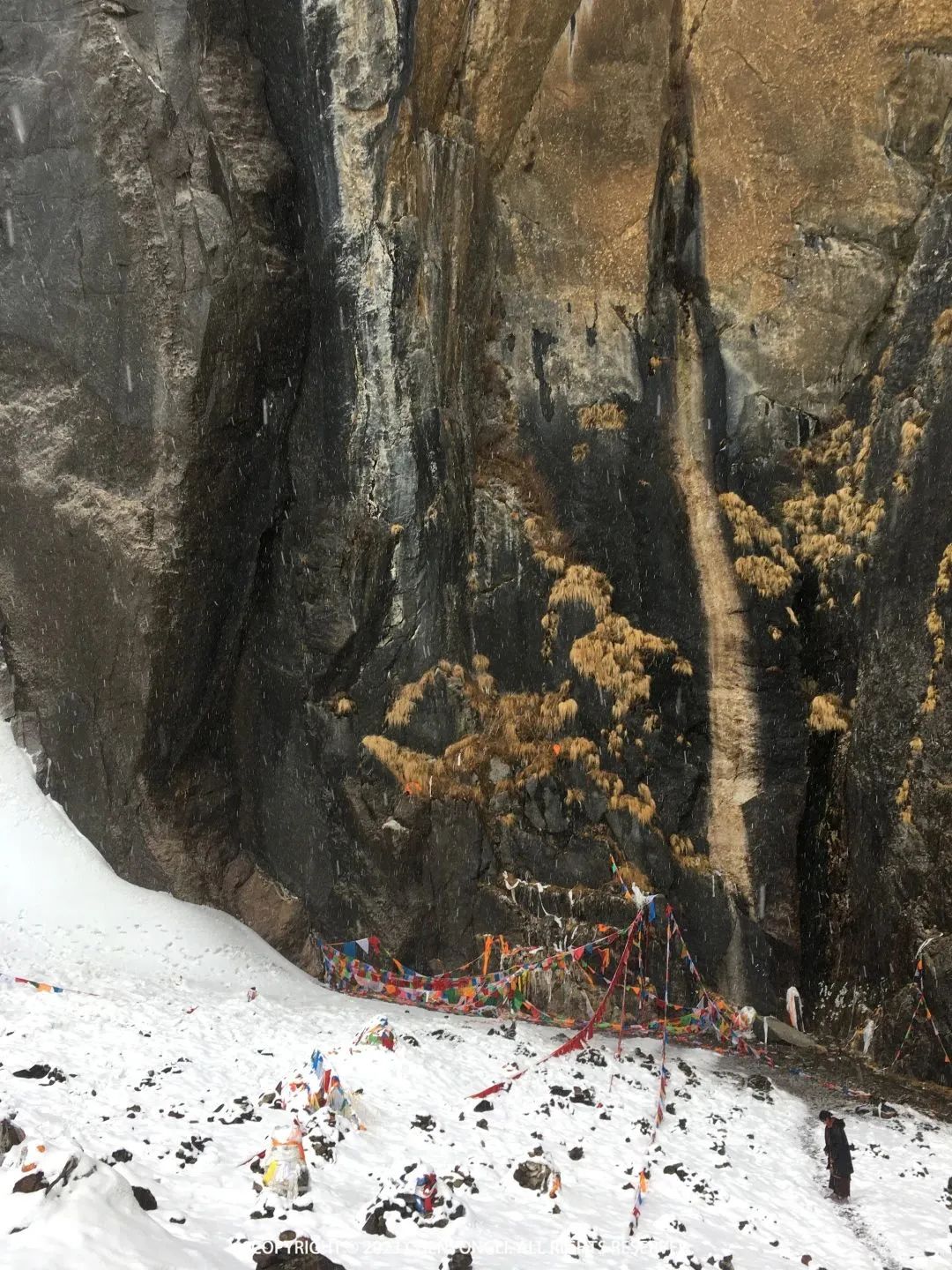 11:30 到达朝圣营地,在这里休息了一下,然后我们四个小分队女生非常不服输的要冲在前面,于是有了一路冲锋。12:30 到达神瀑,爬升过程中还有积雪覆盖,拍到了远处的蓝冰。神瀑的冰已经融化,可以看到几股小水流,在这遇到当地藏民也在朝圣。