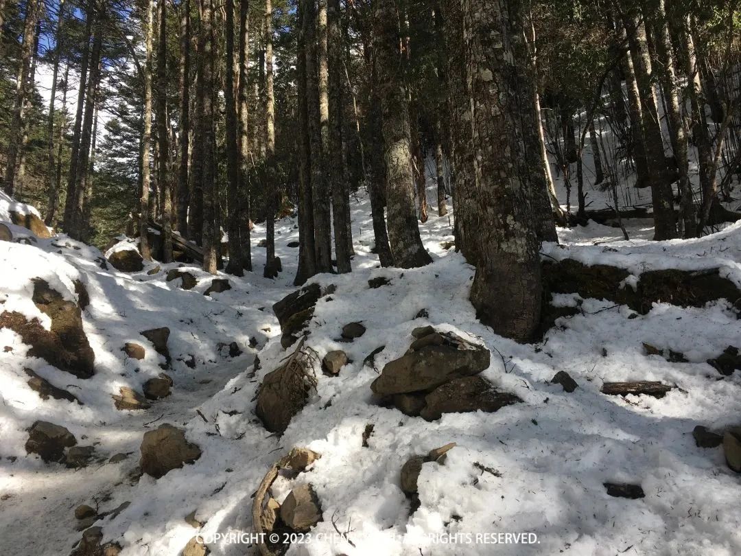 走到垭口处,上面有很厚的积雪覆盖,这时已经穿上冰爪防滑了。没想到我还是第一小分队,那可以自豪的给大家分享点爬升技巧了:一定要有目标,让自己爬到某个地方再休息,休息一下缓过来就走,这样才能保持速度,走几步就歇息速度就会很慢,而且歇息得越久越不想走。