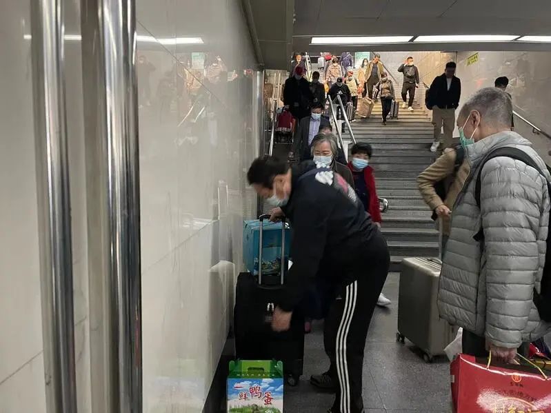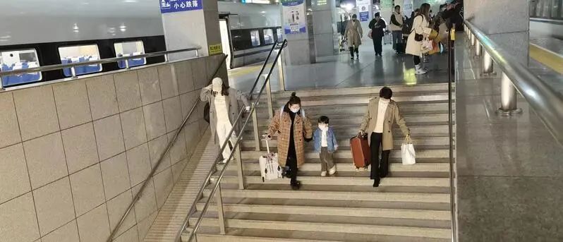旅客把行李放在过道一侧,再返回去拿其他行李20分钟过去,这一班次的旅客走得差不多了,记者注意到,站台上一位30多岁的女子犹豫了很久决定走台阶。她先是扛着一部手推轮椅一步步从楼梯上搬下来。她身后跟着一位腿脚不便的老太太。只见老太太小心翼翼地扶着栏杆,艰难地一步一步走下台阶。老太太下来后,女子扶她坐到轮椅上,然后转身再跑上月台。在那里一个五六岁的男孩正守着几件行李。女子叫男孩站着不动,自己又拖着两件行李一步步走下台阶,然后再返回拿剩下的行李。看到行李都拖下去了,男孩小小的身板扛起最后一件行李,跟着女子走下来,因为走得急,男孩差点被绊倒。