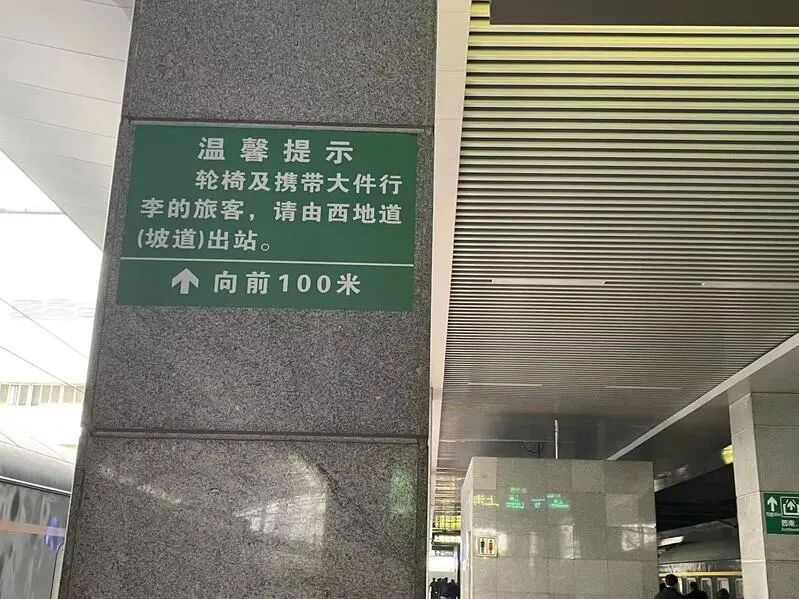 月台上标的提示,但注意到提示的旅客很少环顾四周,上海站东侧一共有5条平行的地下通道,全是这样的楼梯,没有电梯,旅客们只能一步步“负重”走台阶。记者注意到,月台的大理石柱上标有“绿色温馨提示”:轮椅及携带大件行李的旅客,请由西地道(坡道)出站,且标明“向前100米”。但记者和代表发现,大多数旅客都是初次来上海,出站这一瞬他们基本上是被人流带着走向最近的通道,很少有旅客注意到这个“提示”。即使是经常乘火车的老常客,往往走到东侧地道前,才想起西侧是坡道,但走到西侧又要花不少时间,只好扛起箱子默默下台阶。