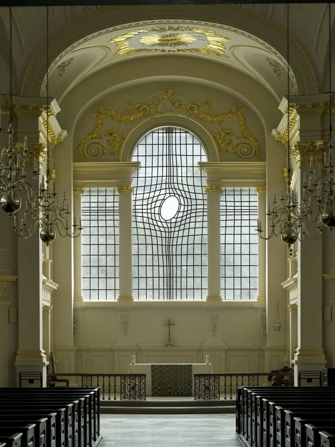 2008年,施拉泽·赫什阿里曾受委托,和建筑师Pip Horne合作设计了伦敦St Martin-in-the-Fields教堂的东窗,最终成果为一个圆形的、自内向外延伸的十字架。©施拉泽·赫什阿里,图片由里森画廊提供赫什阿里画作中由面纱、薄膜和迷雾构成的语言,是她身份认知的扩张。在她创作的空间中,在一呼一吸间,不存在本体论的抵抗,只有世界的回声覆盖着。当普遍性或是独特性都提出了有效的主张,即使回归精神,赫什阿里所创造的世界好像也失去了组成一个世界的能力。如同《大图景》(2020)中涓涌的石墨铅笔印记,混合着阿拉伯单词或短语,赘述着“我是”与“我不是”,频频出现的语言漂浮着,和着吸气与呼气,自天至地,从细胞到身体,仿佛宇宙之初的混沌。