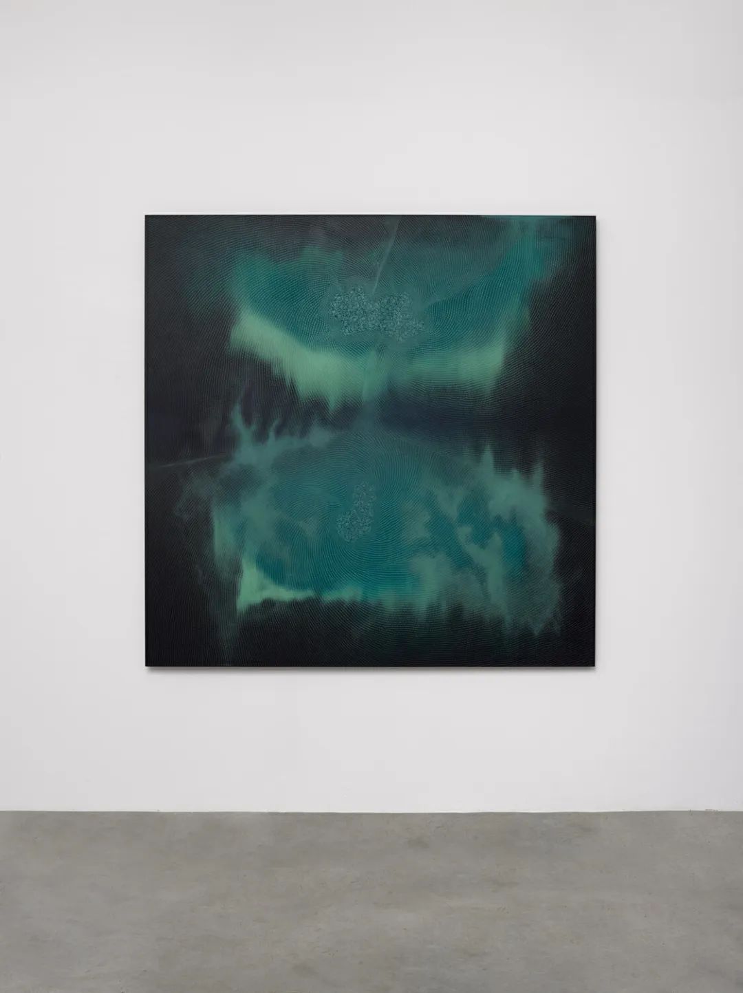 《大图景》及其局部,2020,黑色 Aquacryl 颜料、色粉、铅笔、铝板,190 x 190 x 5.5 cm,©施拉泽·赫什阿里,图片由里森画廊提供赫什阿里已然超脱出普世的姿态。当她任由液体颜料的自主流动形成作品中的波纹和褶皱时,画布上如同结缔般的丝线组织也将停止变化。在表达凝固之时,我们或许可以知晓,宇宙万物终将陨灭并不是假设——在某种意义上,这是当今世界上每一个思想需要认知的既定事实。而这样的包罗万象,使我们无从得知生命的兴衰或是潮汐到底是为了什么。一切都在持续发生着,就如同存在本身。