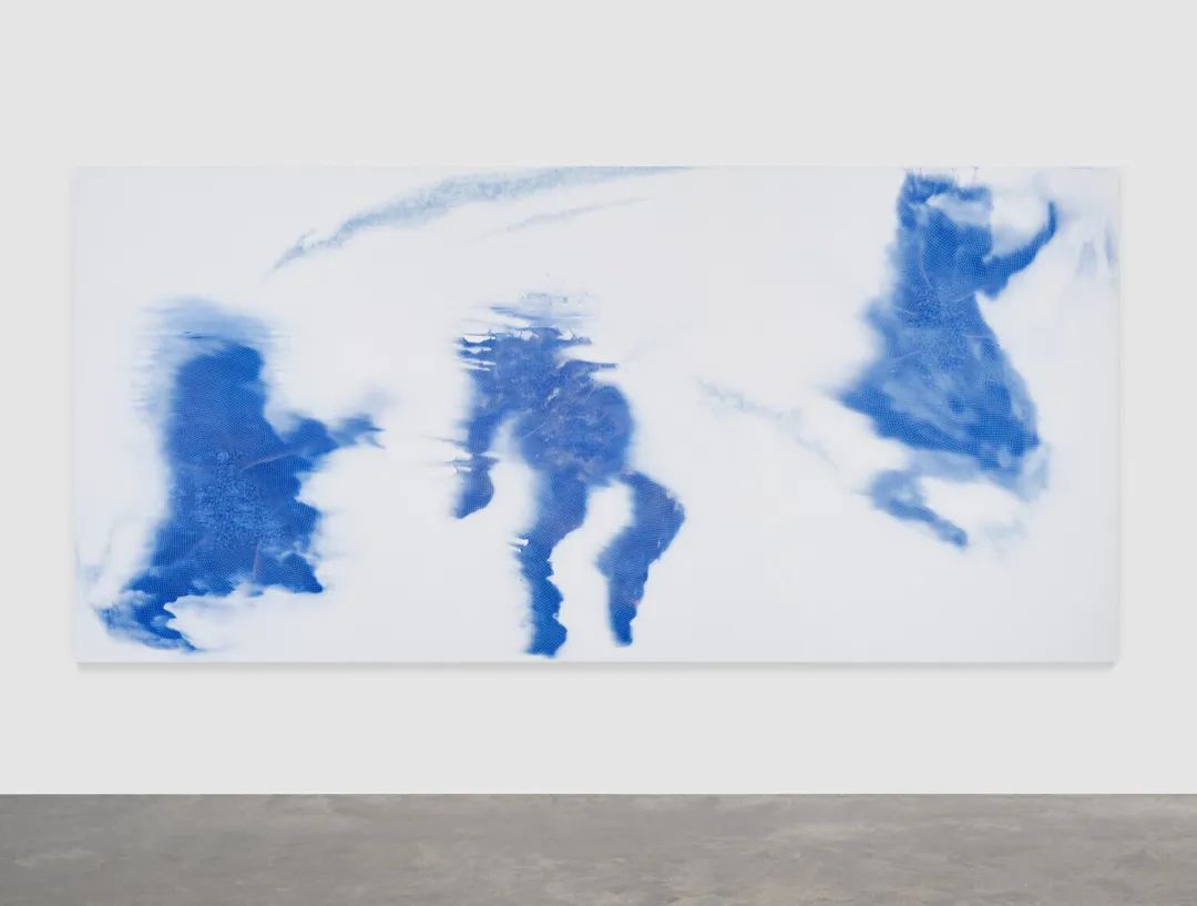 《气息》(2003/2013)在“根茎”展览现场,四频道影像,500 x 560 x 430 cm,©施拉泽·赫什阿里,图片由里森画廊提供步入展览,可以看到赫什阿里创作的多幅绘画作品。每幅作品都如经脉一般跳动着,仿佛是经由艺术家开启的一轮又一轮新的生命周期。其中,最为瞩目的画面是《大地之歌》(2021)中三个独立的天蓝色形象,好似正在舞蹈着的人物姿态被放慢了动作,然后定格,使人联想到开创了定格动画的摄影师Eadward Muybridge,但又不那么机械。这幅作品的灵感来源于赫什阿里将颜料泼撒在空白间的偶发,艺术家自身的身体运动与情感被镌刻为画布的铭文。最终,作品的动态感,正是由于人为干预的让步而得以实现。