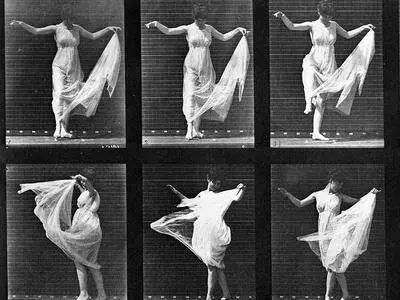 上图:《大地之歌》,2021,白色 Aquacryl 颜料、色粉、铅笔、铝板,190 x 400 x 5 cm,©施拉泽·赫什阿里,图片由里森画廊提供下图:Eadward Muybridge, Dancing Woman, Plate 187 from 'Animal Locomotion', 1887